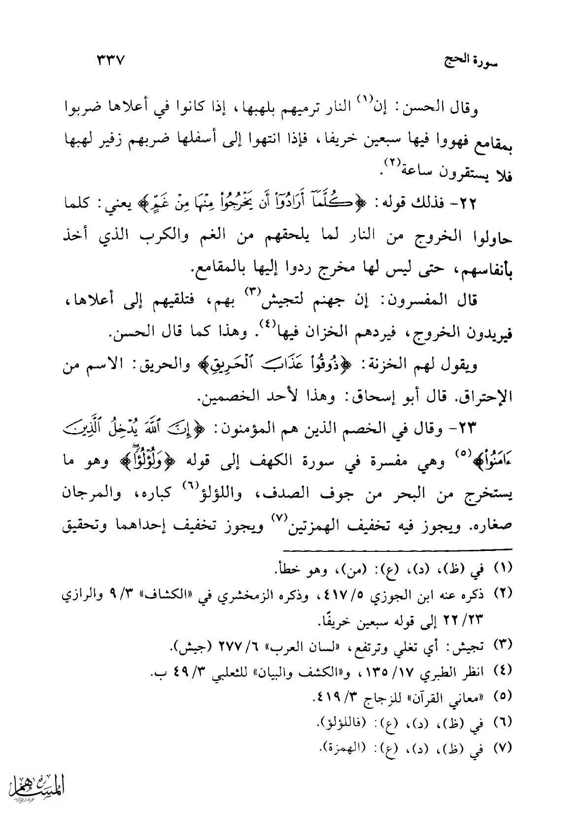 23 - وقال في الخصم الذين هم المؤمنون: {إِنَّ اللَّهَ يُدْخِلُ الَّذِينَ آمَنُوا} (¬5) وهي مفسرة في سورة الكهف إلى قوله {وَلُؤْلُؤًا} وهو ما يستخرج من البحر من جوف الصدف، واللؤلؤ (¬6) كباره، والمرجان صغاره. ويجوز فيه تخفيف الهمزتين (¬7) ويجوز تخفيف إحداهما وتحقيق