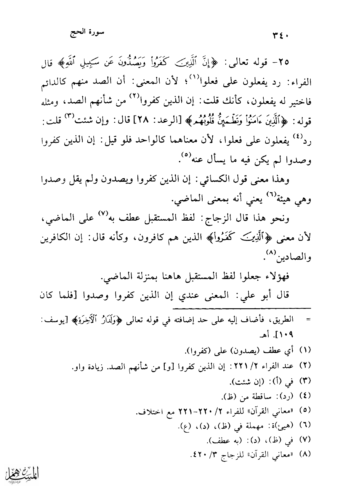 (¬2) عند الفراء 2/ 221: إن الذين كفروا [و] من شأنهم الصد. زيادة واو.