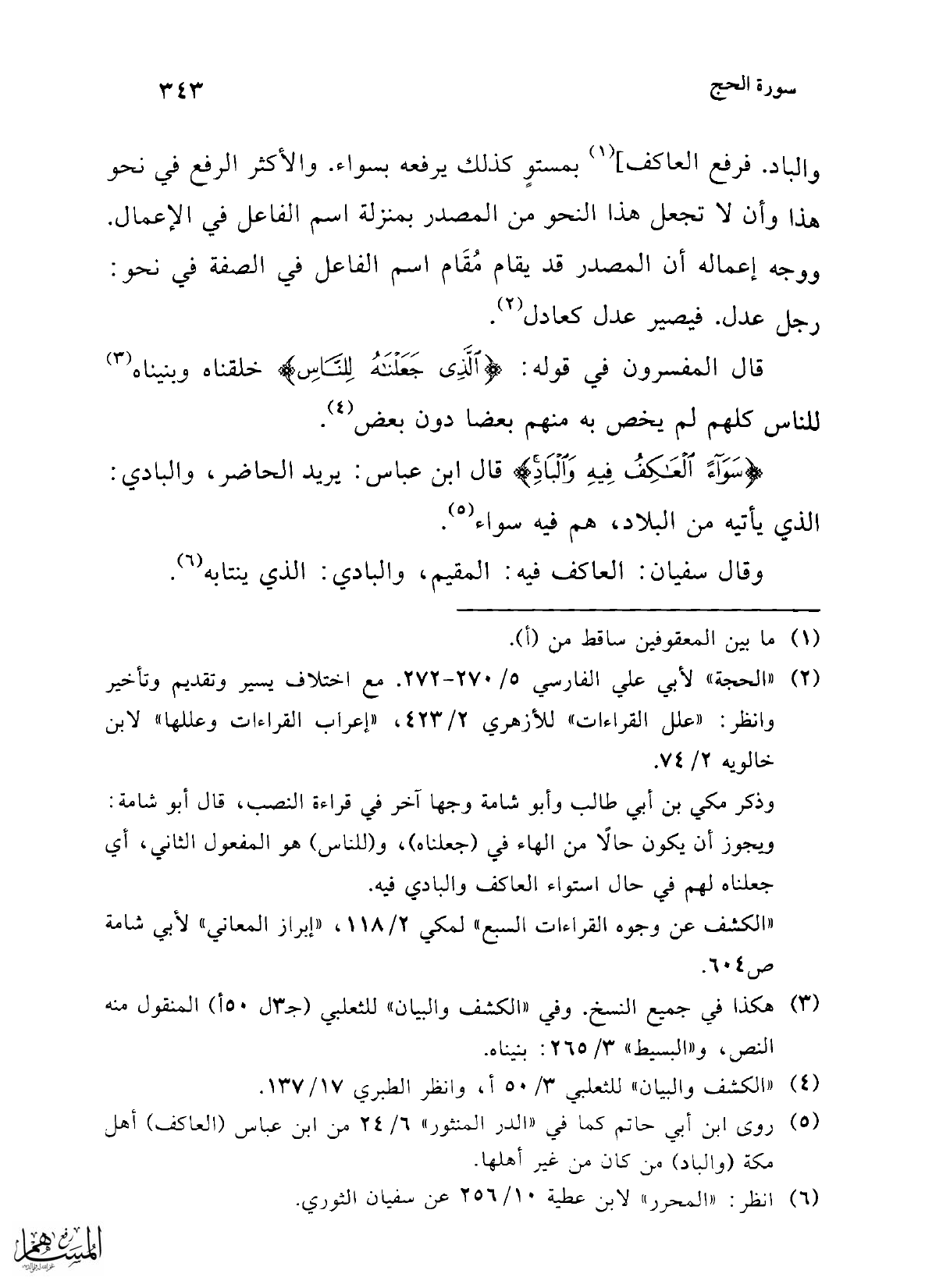 وذكر مكي بن أبي طالب وأبو شامة وجهاً آخر في قراءة النصب، قال أبو شامة: ويجوز أن يكون حالاً من الهاء في (جعلناه)، و (للناس) هو المفعول الثاني، أي جعلناه لهم في حال استواء العاكف والبادي فيه.