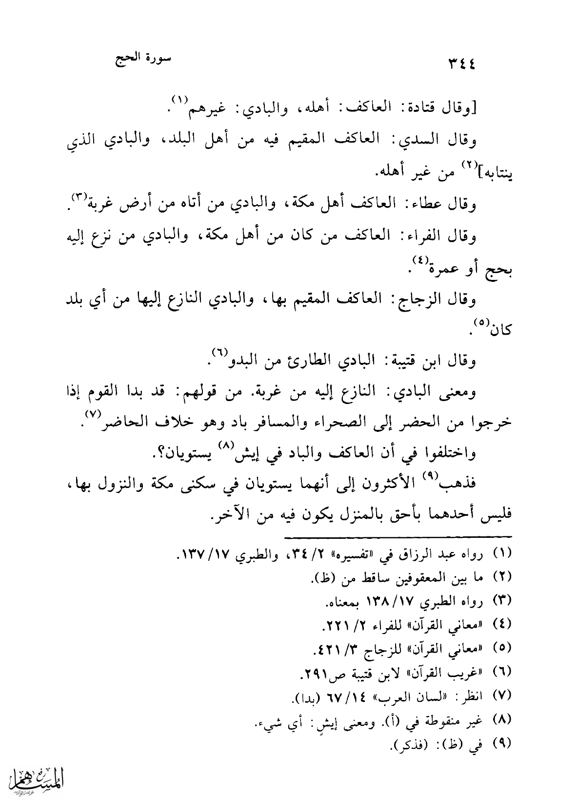 وقال الزجاج: العاكف المقيم بها، والبادي النازع إليها من أي بلد كان (¬5).