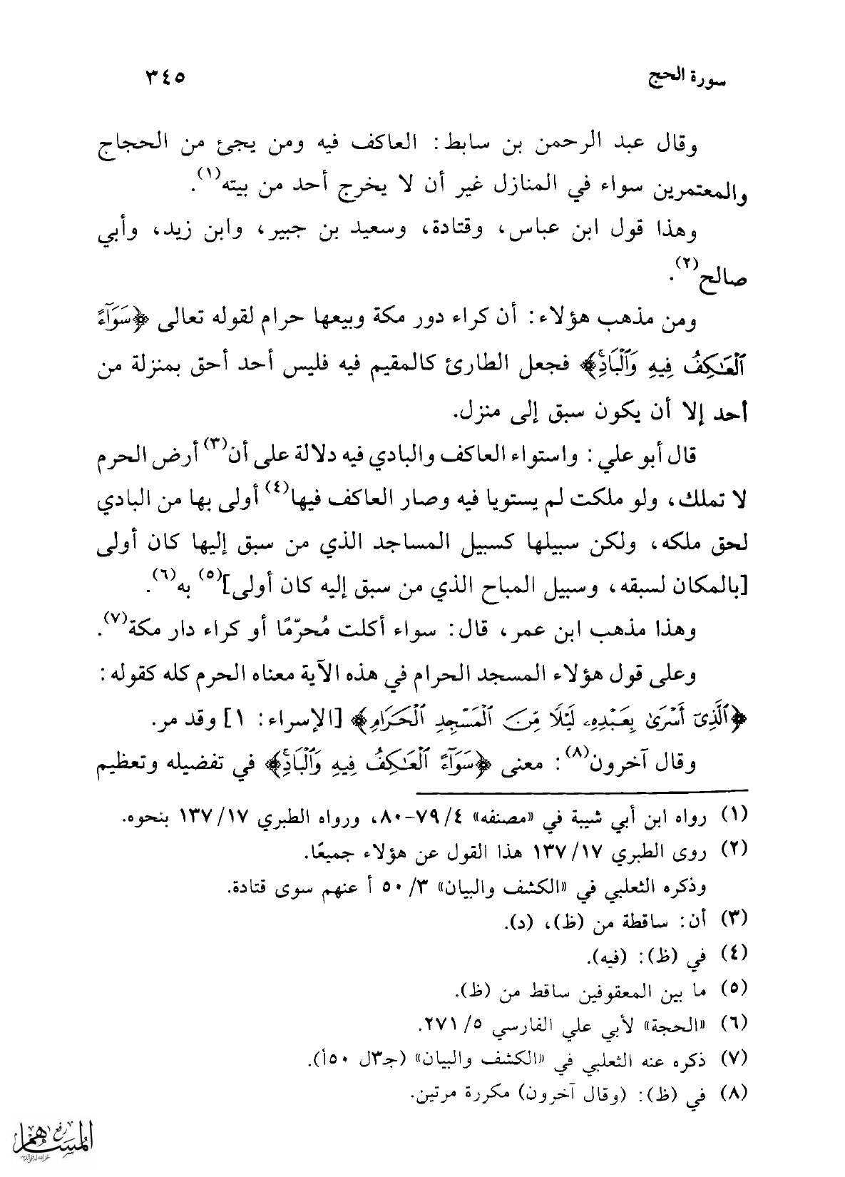 قال أبو علي: واستواء العاكف والبادي فيه دلالة على أن (¬3) أرض الحرم لا تملك، ولو ملكت لم يستويا فيه وصار العاكف فيها (¬4) أولى بها من البادي لحق ملكه، ولكن سبيلها كسبيل المساجد الذي من سبق إليها كان أولى [بالمكان لسبقه، وسبيل المباح الذي من سبق إليه كان أولى] (¬5) به (¬6).
