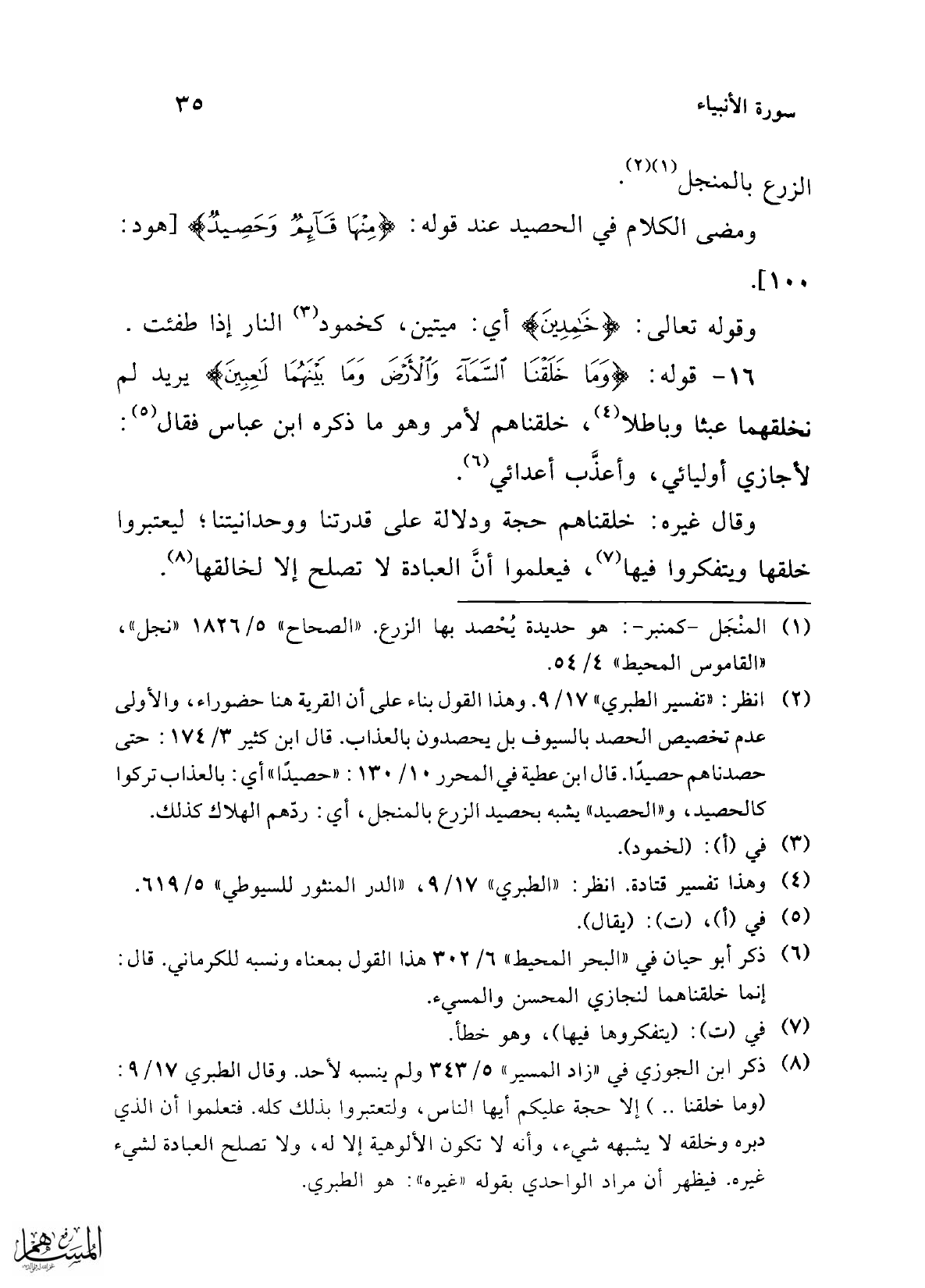 (¬2) انظر:"تفسير الطبري" 17/ 9. وهذا القول بناء على أن القرية هنا حضوراء، والأولى عدم تخصيص الحصد بالسيوف بل يحصدون بالعذاب. قال ابن كثير 3/ 174: حتى حصدناهم حصيدًا. قال ابن عطية في المحرر 10/ 130: "حصيدًا" أي: بالعذاب تركوا كالحصيد، و"الحصيد" يشبه بحصيد الزرع بالمنجل، أي: ردّهم الهلاك كذلك.