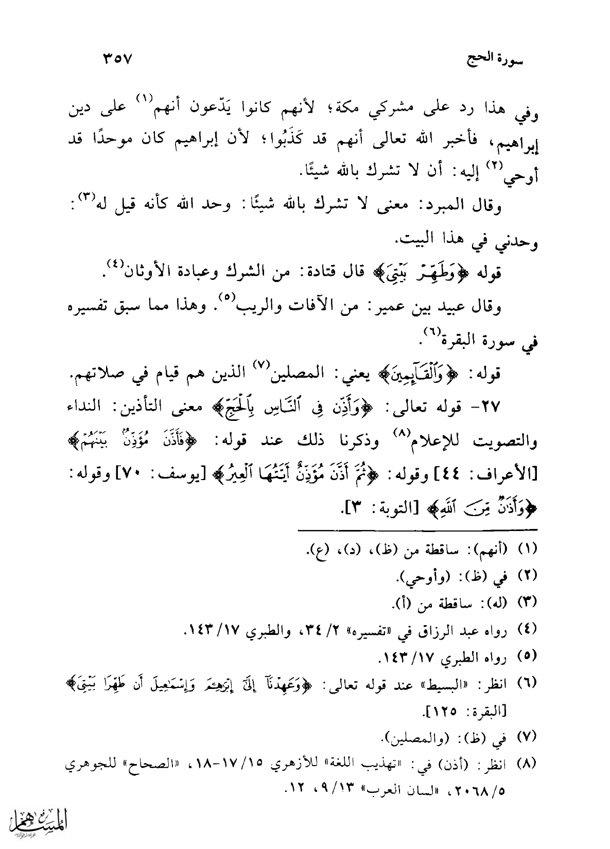 وقال المبرد: معنى لا تشرك باللهِ شيئًا: وحد الله كأنه قيل له (¬3): وحدني في هذا البيت.
