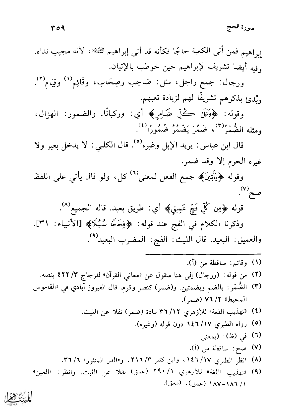 وذكرنا الكلام في الفج عند قوله: ميه {فِجَاجًا سُبُلًا} [الأنبياء: 31]. والعميق: البعيد. قال الليث: الفج: المضرب البعيد (¬9).