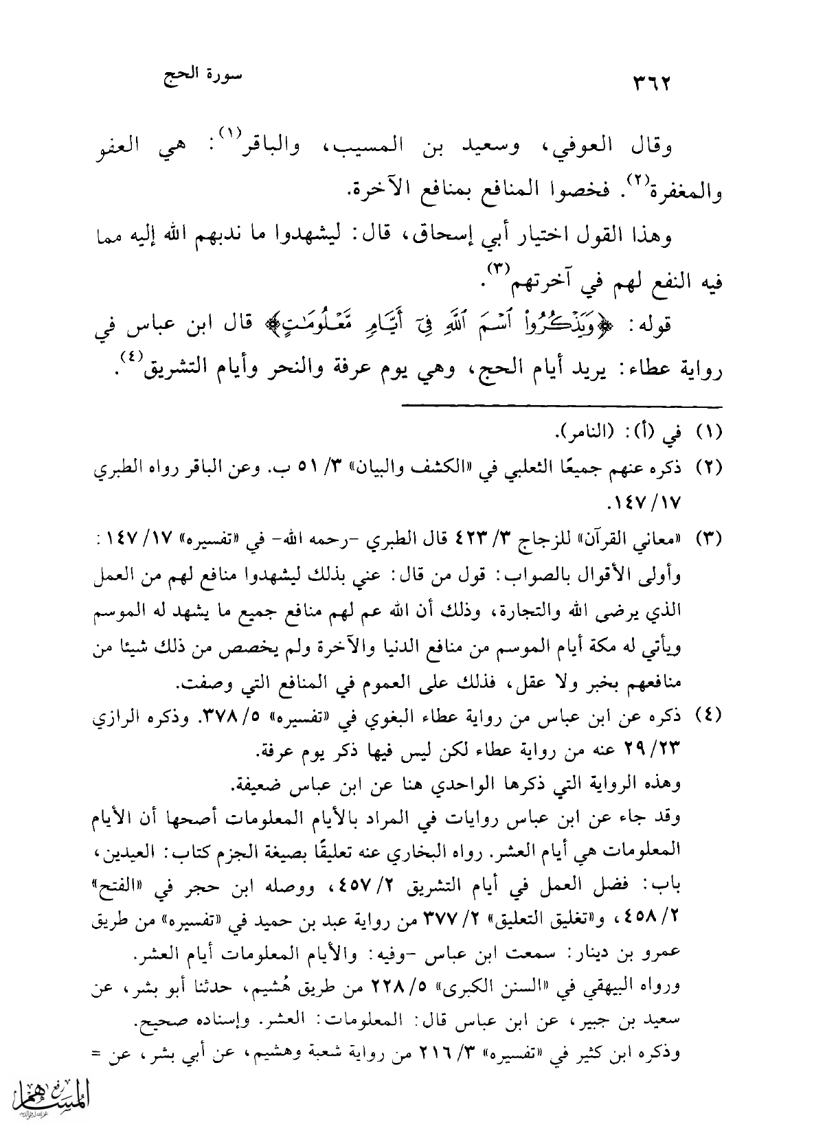(¬3) "معاني القرآن" للزجاج 3/ 423 قال الطبري -رحمه الله- في "تفسيره" 17/ 147: وأولى الأقوال بالصواب: قول من قال: عني بذلك ليشهدوا منافع لهم من العمل الذي يرضي الله والتجارة، وذلك أن الله عم لهم منافع جميع ما يشهد له الموسم ويأتي له مكة أيام الموسم من منافع الدنيا والآخرة ولم يخصص من ذلك شيئا من منافعهم بخبر ولا عقل، فذلك على العموم في المنافع التي وصفت.