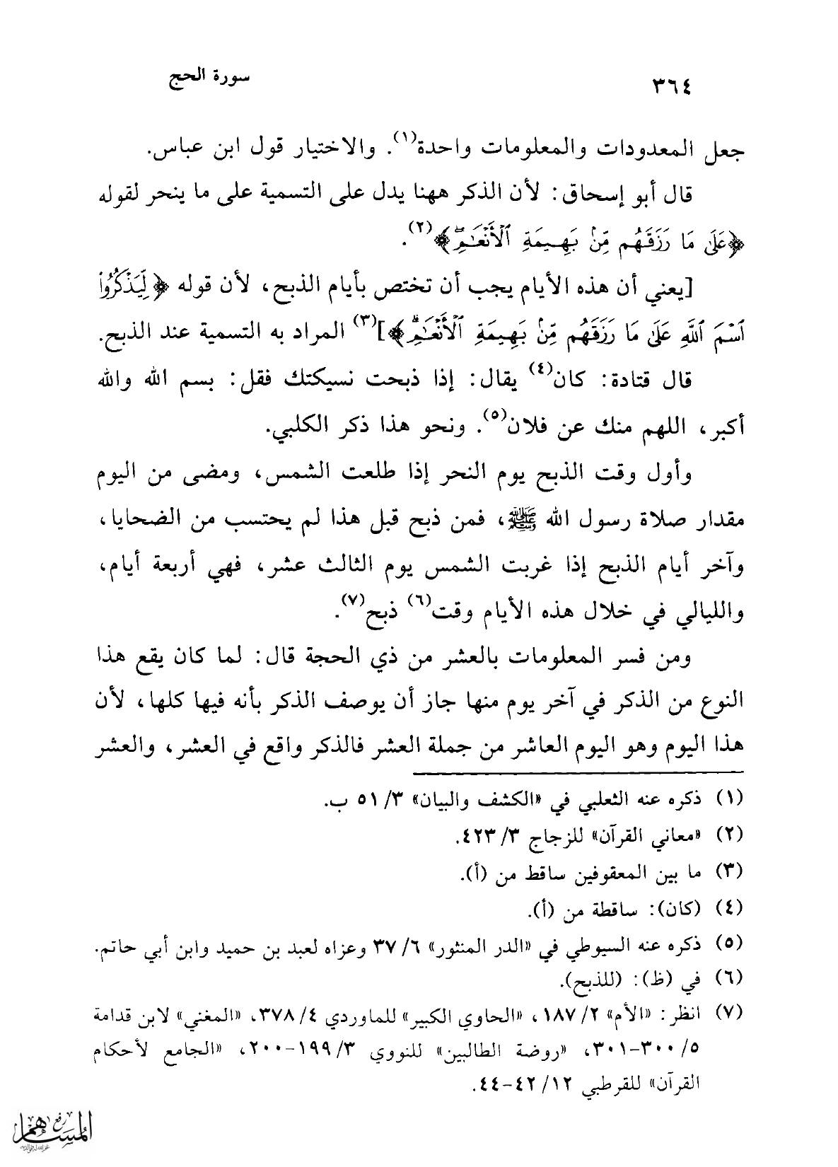 [يعني أن هذه الأيام يجب أن تختص بأيام الذبح، لأن قوله {لِيَذْكُرُوا اسْمَ اللَّهِ عَلَى مَا رَزَقَهُمْ مِنْ بَهِيمَةِ الْأَنْعَامِ} (¬3) المراد به التسمية عند الذبح.