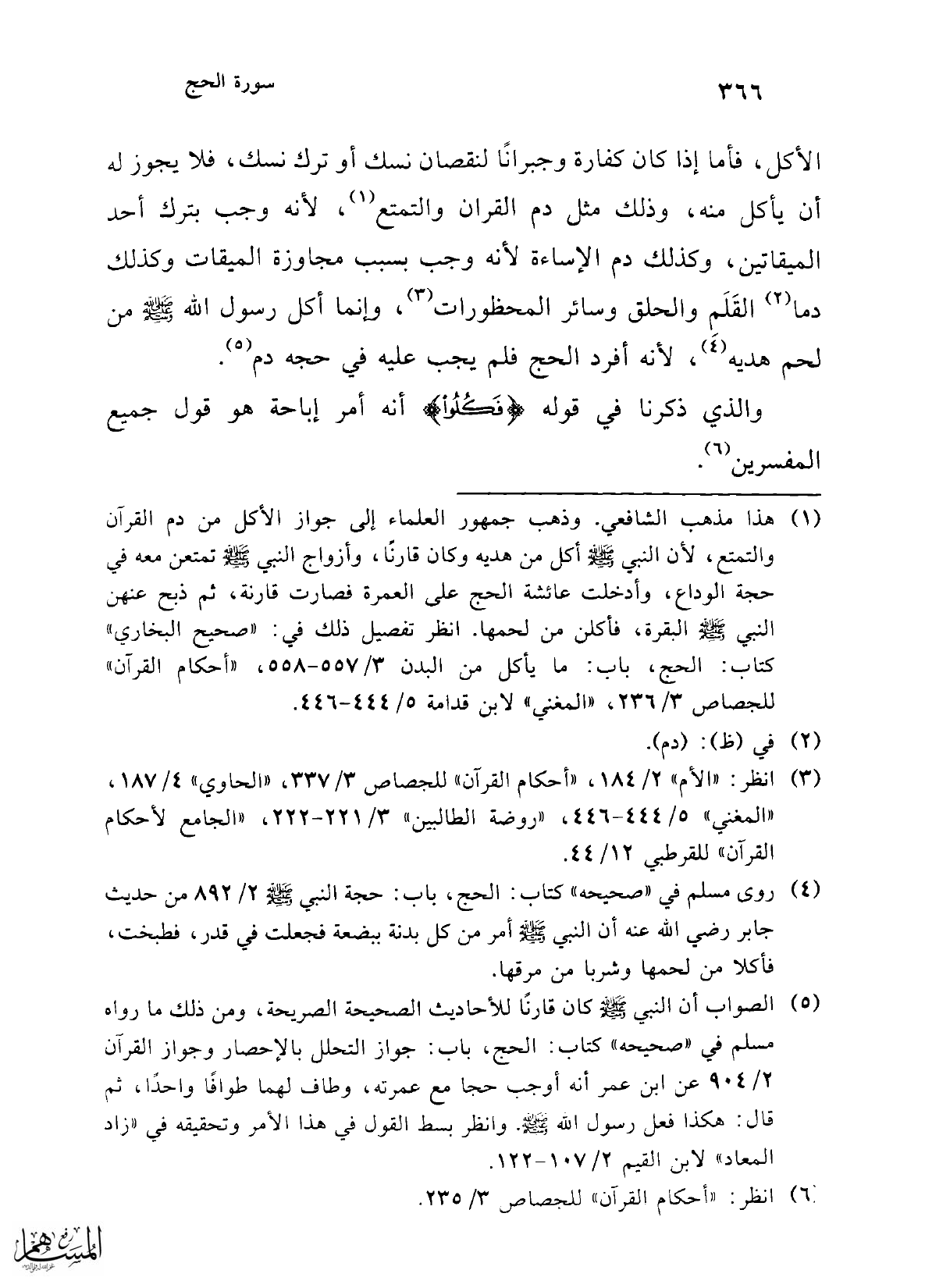 الأكل، فأما إذا كان كفارة وجبرانًا لنقصان نسك أو ترك نسك، فلا يجوز له أن يأكل منه، وذلك مثل دم القرآن والتمتع (¬1)؛ لأنه وجب بترك أحد الميقاتين، وكذلك دم الإساءة لأنه وجب بسبب مجاوزة الميقات وكذلك دما (¬2) القَلَمِ والحلق وسائر المحظورات (¬3)، وإنما أكل رسول الله -صلى الله عليه وسلم- من لحم هديه (¬4)، لأنه أفرد الحج فلم يجب عليه في حجه دم (¬5).
