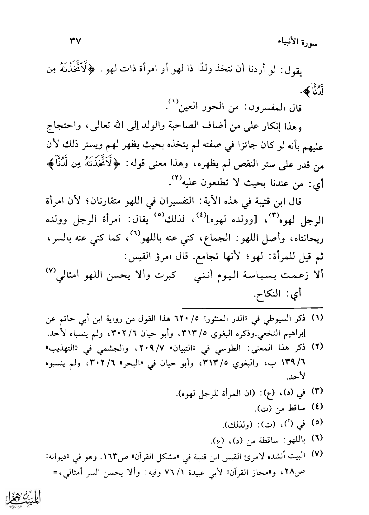 قال ابن قتيبة في هذه الآية: التفسيران في اللهو متقارنان؛ لأن امرأة الرجل لهوه (¬3)، [وولده لهوه] (¬4)، لذلك (¬5) يقال: امرأة الرجل وولده ريحانتاه، وأصل اللهو: الجماع، كني عنه باللهو (¬6)، كما كني عنه بالسر، ثم قيل للمرأة: لهو؛ لأنها تجامع. قال امرؤ القيس: