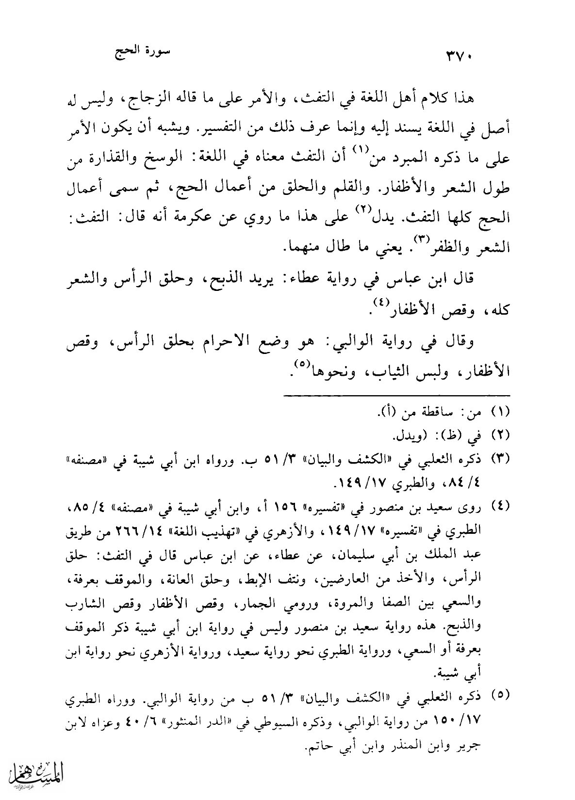 (¬4) روى سعيد بن منصور في "تفسيره" 156 أ، وابن أبي شيبة في "مصنفه" 4/ 85، الطبري في "تفسيره" 17/ 149، والأزهري في "تهذيب اللغة" 14/ 266 من طريق عبد الملك بن أبي سيمان، عن عطاء، عن ابن عباس قال في التفث: حلق الرأس، والأخذ من العارضين، ونتف الإبط، وحلق العانة، والموقف بعرفة، والسعي بين الصفا والمروة، ورومي الجمار، وقص الأظفار وقص الشارب والذبح. هذه رواية سعيد بن منصور وليس في رواية ابن أبي شيبة ذكر الموقف بعرفة أو السعي، ورواية الطبري نحو رواية سعيد، ورواية الأزهري نحو رواية ابن أبي شيبة.