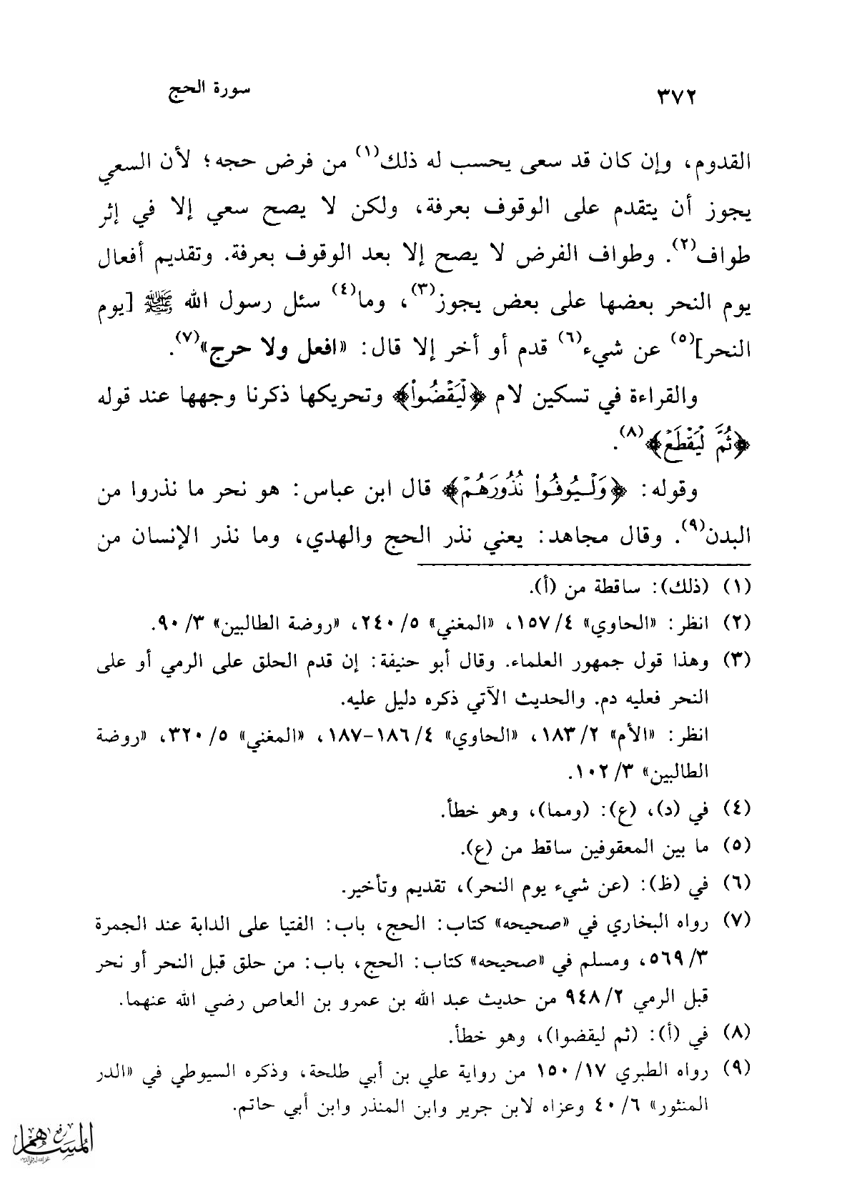 القدوم، وإن كان قد سعى يحسب له ذلك (¬1) من فرض حجه؛ لأن السعي يجوز أن يتقدم على الوقوف بعرفة، ولكن لا يصح سعي إلا في إثر طواف (¬2). وطواف الفرض لا يصح إلا بعد الوقوف بعرفة. وتقديم أفعال يوم النحر بعضها على بعض يجوز (¬3)، وما (¬4) سئل رسول الله -صلى الله عليه وسلم-[يوم النحر] (¬5) عن شيء (¬6) قدم أو أخر إلا قال: "افعل ولا حرج" (¬7).