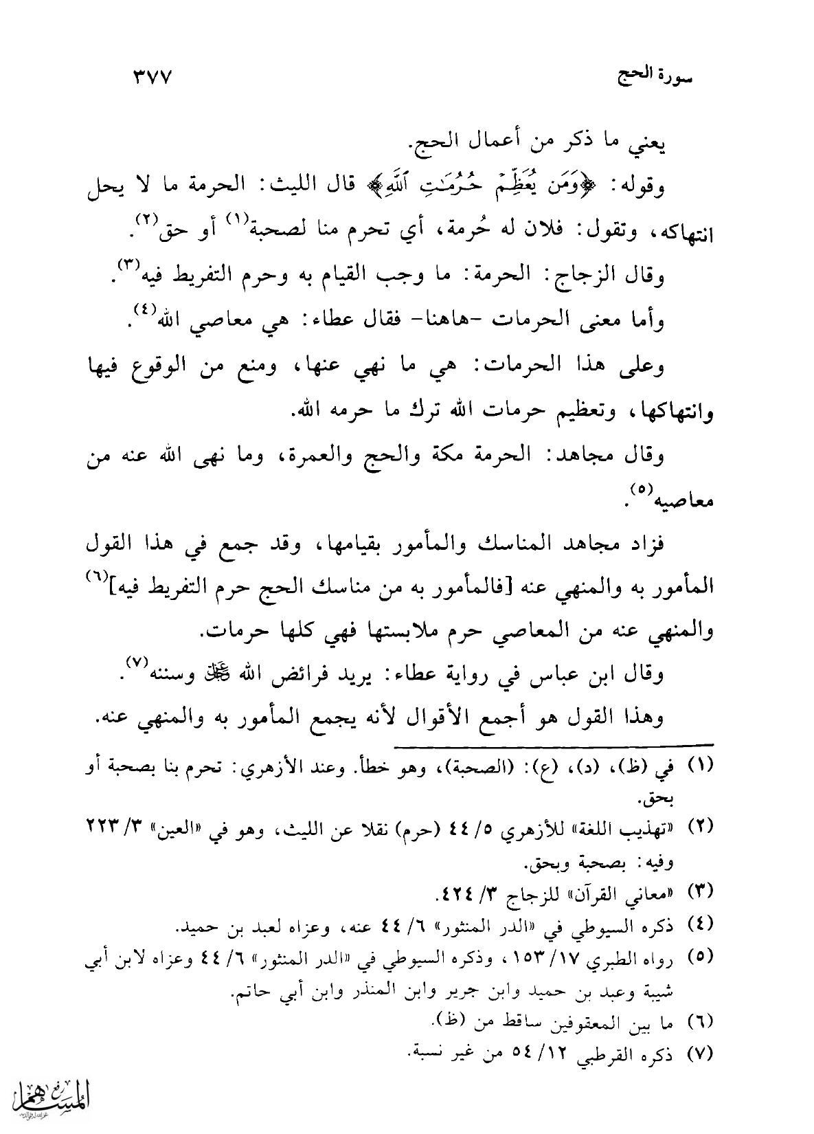 فزاد مجاهد المناسك والمأمور بقيامها، وقد جمع في هذا القول المأمور به والمنهي عنه [فالمأمور به من مناسك الحج حرم التفريط فيه] (¬6) والمنهي عنه من المعاصي حرم ملابستها فهي كلها حرمات.