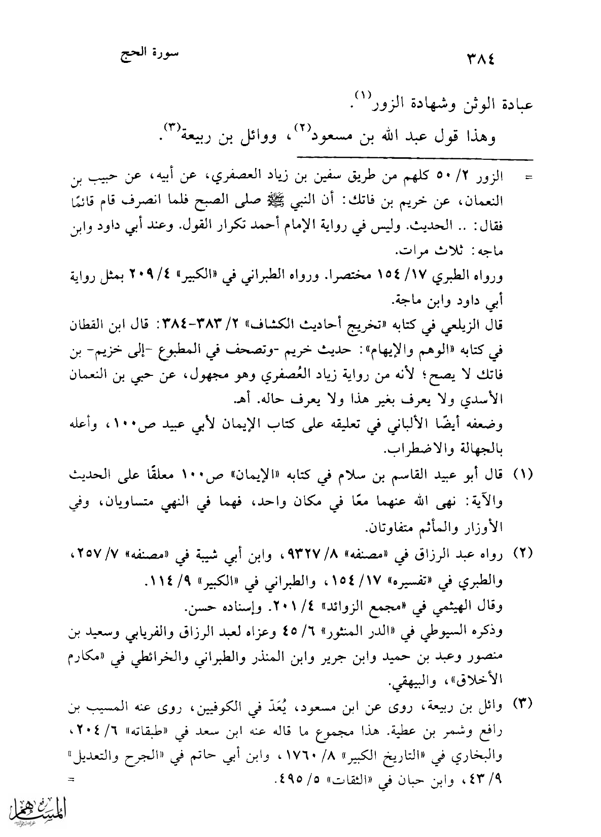 = الزور 2/ 50 كلهم من طريق سفين بن زياد العصفري، عن أبيه، عن حبيب بن النعمان، عن خريم بن فاتك: أن النبي -صلى الله عليه وسلم- صلى الصبح فلما انصرف قام قائمًا فقال: .. الحديث. وليس في رواية الإمام أحمد تكرار القول. وعند أبي داود وابن ماجه: ثلاث مرات.