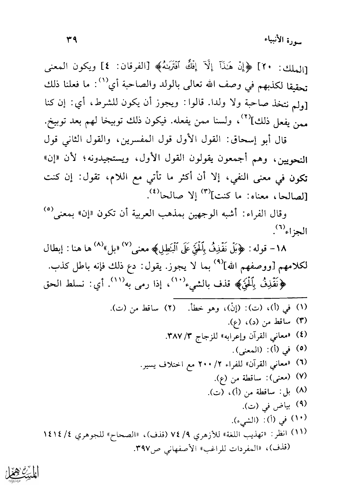 18 - قوله: {بَلْ نَقْذِفُ بِالْحَقِّ عَلَى الْبَاطِلِ} معنى (¬7) "بل" (¬8) هاهنا: إبطال لكلامهم [ووصفهم الله] (¬9) بما لا يجوز. يقول: دع ذلك فإنه باطل كذب.