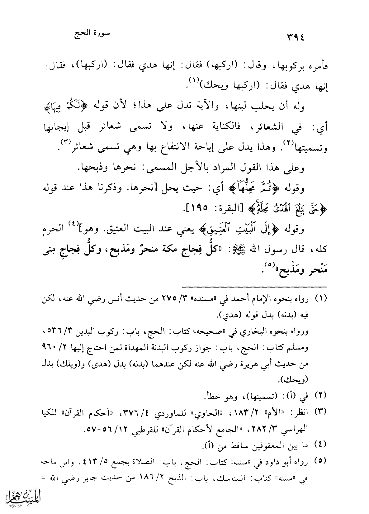 وقوله {إِلَى الْبَيْتِ الْعَتِيقِ} يعني عند البيت العتيق. وهو] (¬4) الحرم كله، قال رسول الله -صلى الله عليه وسلم-: "كلُّ فِجاج مكة منحرٌ ومَذبح، وكلُّ فِجاجِ مِنى مَنْحر ومَذْبح" (¬5).