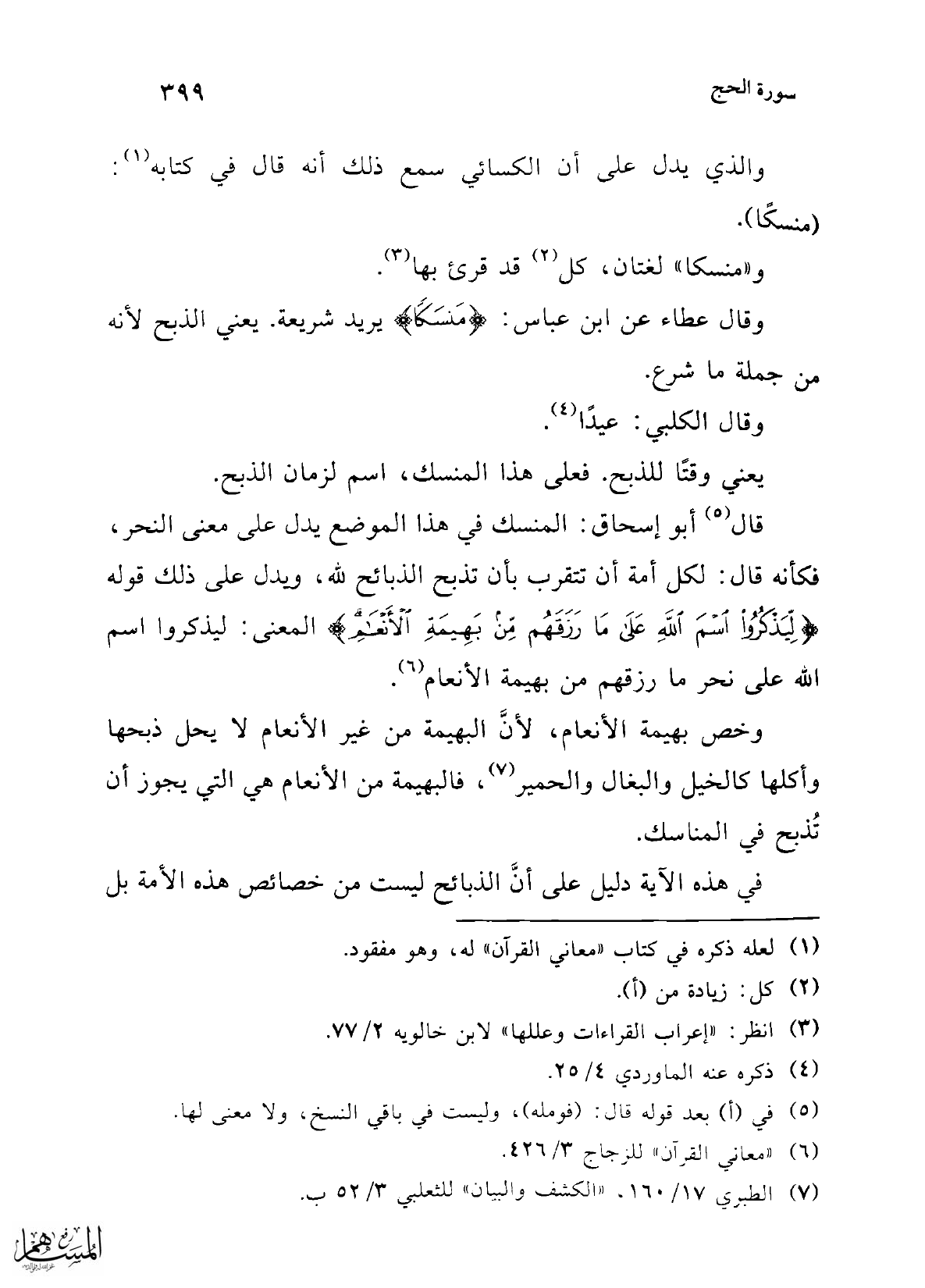 والذي يدل على أن الكسائي سمع ذلك أنه قال في كتابه (¬1): (منسكًا).