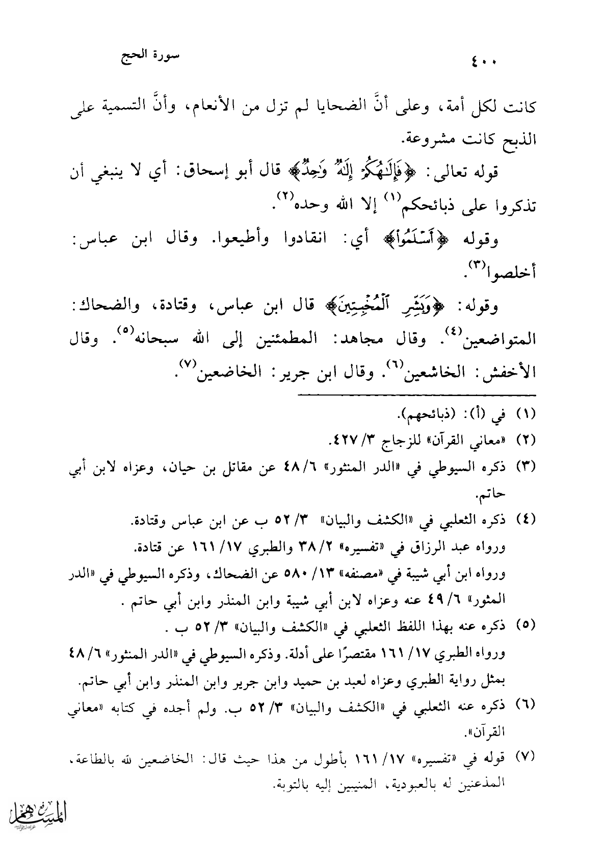 (¬7) قوله في "تفسيره" 17/ 161 بأطول من هذا حيث قال: الخاضعين لله بالطاعة، المذعنيق له بالعبودية، المنيبين إليه بالتوبة.