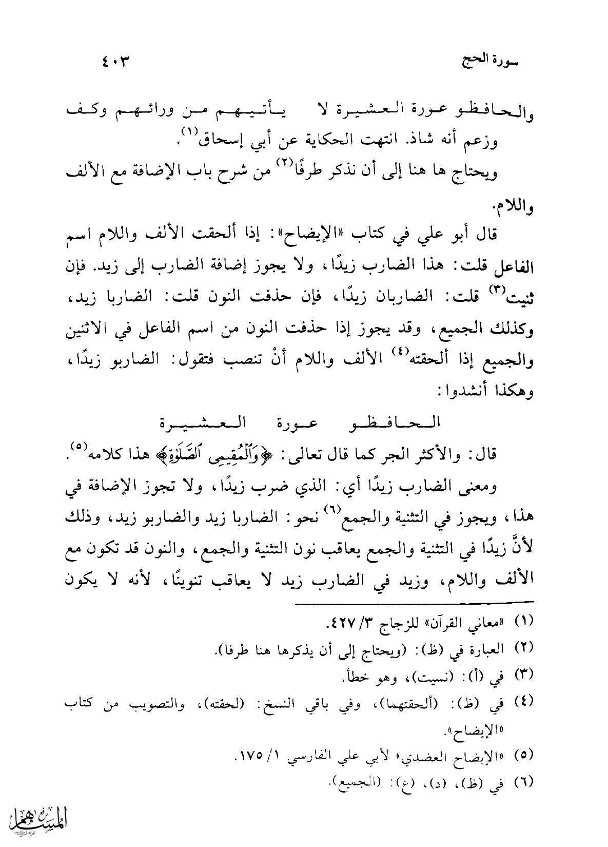 قال: والأكثر الجر كما قال تعالى: {وَالْمُقِيمِي الصَّلَاةِ} هذا كلامه (¬5).