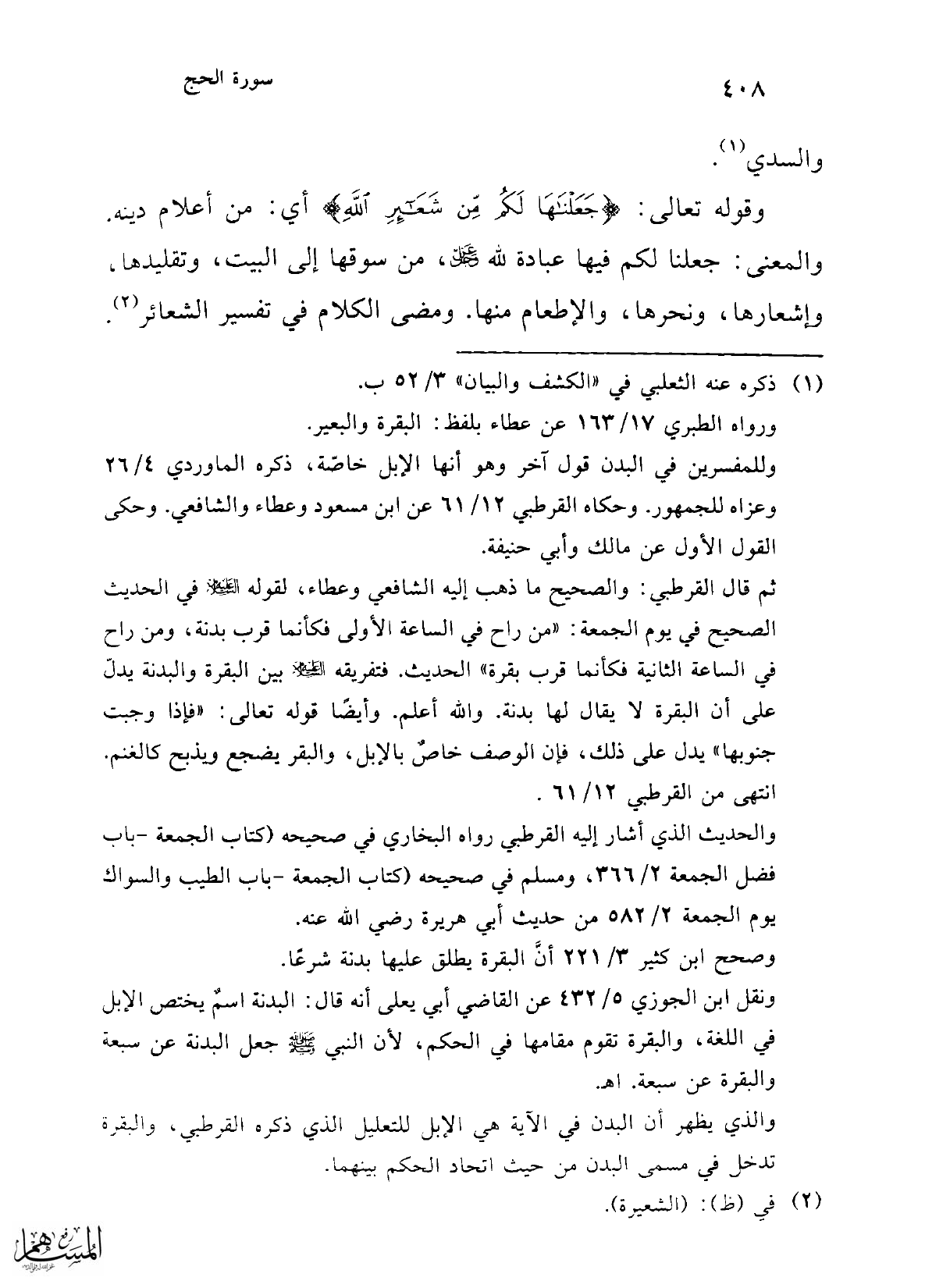 ثم قال القرطبي: والصحيح ما ذهب إليه الشافعي وعطاء، لقوله عليه السلام في الحديث الصحيح في يوم الجمعة: "من راح في الساعة الأولى فكأنما قرب بدنة، ومن راح في الساعة الثانية فكأنما قرب بقرة" الحديث. فتفريقه -عليه السلام- بين البقرة والبدنة يدل على أن البقرة لا يقال لها بدنة. والله أعلم. وأيضًا قوله تعالى: "فإذا وجبت جنوبها" يدل على ذلك، فإن الوصف خاصٌ بالإبل، والبقر يضجع ويذبح كالغنم. انتهى من القرطبي 12/ 61.