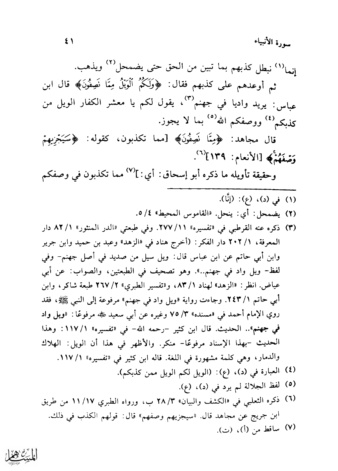 (¬6) ذكره الثعلبي في "الكشف والبيان" 3/ 28 ب، ورواه الطبري 17/ 11 من طريق ابن جريج عن مجاهد قال. "سيجزيهم وصفهم" قال: قولهم الكذب في ذلك.