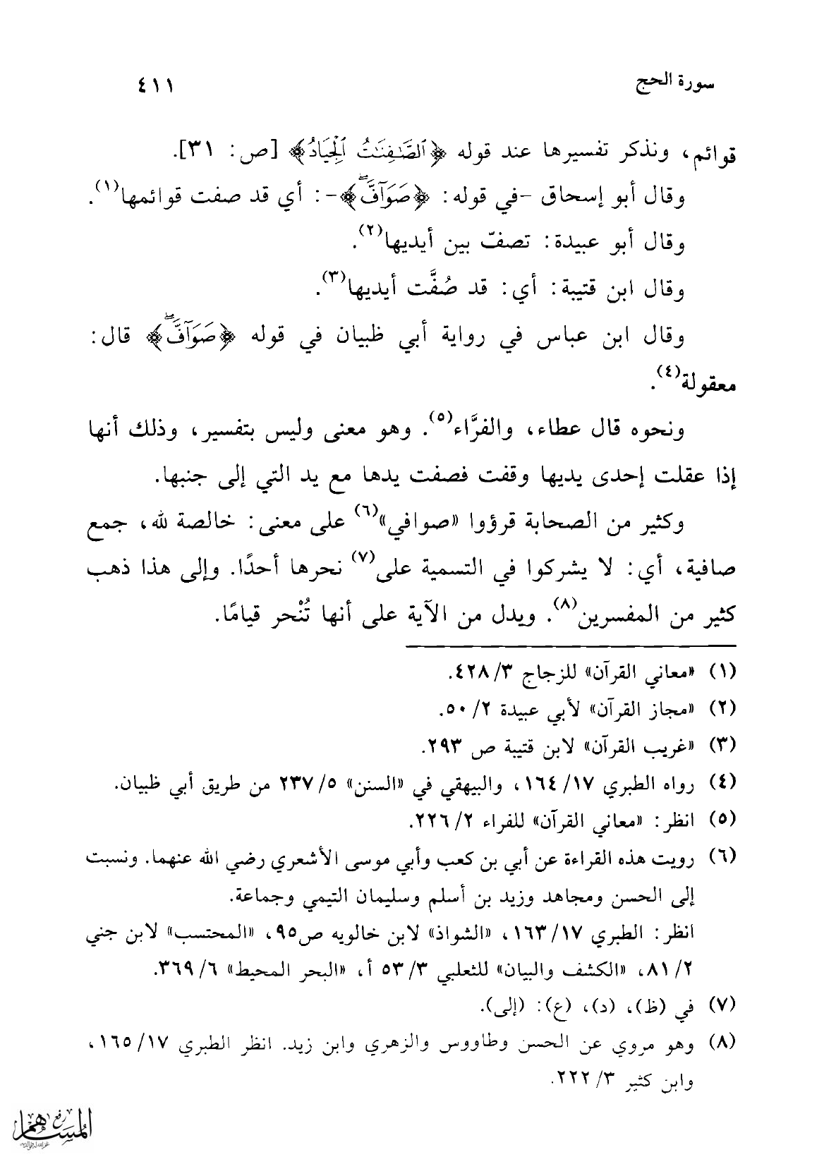 وقال أبو إسحاق -في قوله: {صَوَافَّ} -: أي قد صفت قوائمها (¬1).