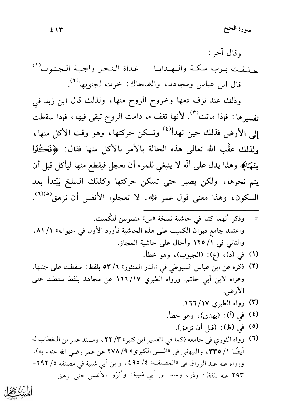 (¬6) رواه الثوري في جامعه (كما في "تفسير ابن كثير" 3/ 22، ومسند عمر بن الخطاب له أيضًا 1/ 335، والبيهقي في "السنن الكبرى" 9/ 278 عن عمر رضي الله عنه، به). ورواه عنه عبد الرزاق "المصنف" 4/ 495، وابن أبي شيبة في مصنفه 5/ 292 - 293 عنه بلفظ: وذر، وعند ابن أبي شيبة: وأقرّوا الأنفس حتى تزهق.