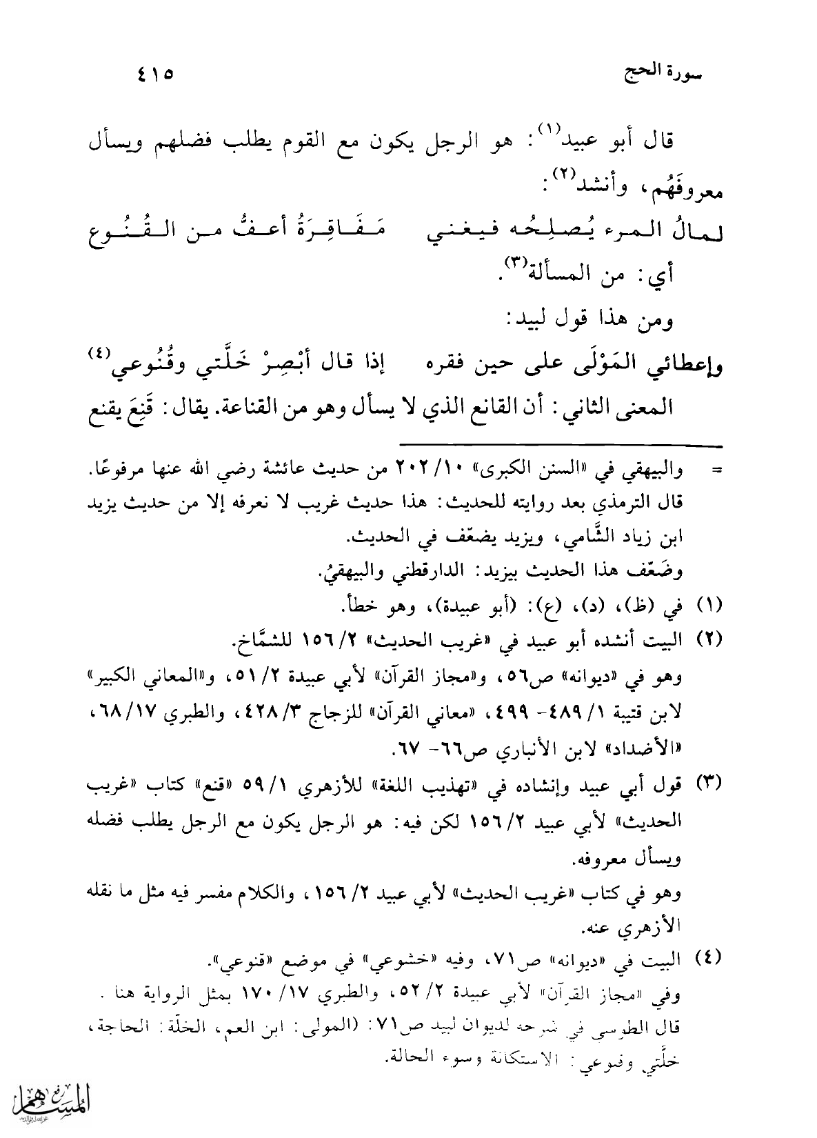 (¬3) قول أبي عبيد وإنشاده في "تهذيب اللغة" للأزهري 1/ 59 "قنع" كتاب "غريب الحديث" لأبي عبيد 2/ 156 لكن فيه: هو الرجل يكون مع الرجل يطلب فضله ويسأل معروفه.