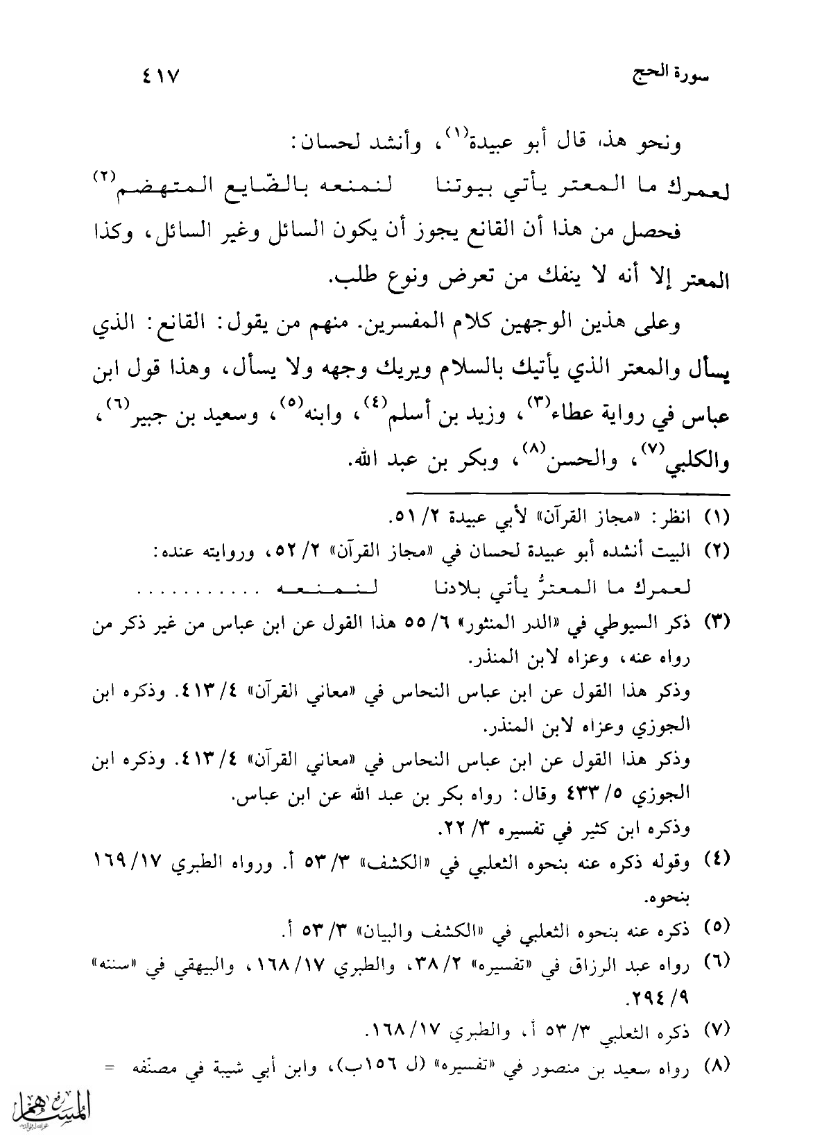 وعلى هذين الوجهين كلام المفسرين. منهم من يقول: القانع: الذي يسأل والمعتر الذي يأتيك بالسلام ويريك وجهه ولا يسأل، وهذا قول ابن عباس في رواية عطاء (¬3)، وزيد بن أسلم (¬4)، وابنه (¬5)، وسعيد بن جبير (¬6)، والكلبي (¬7)، والحسن (¬8)، وبكر بن عبد الله.