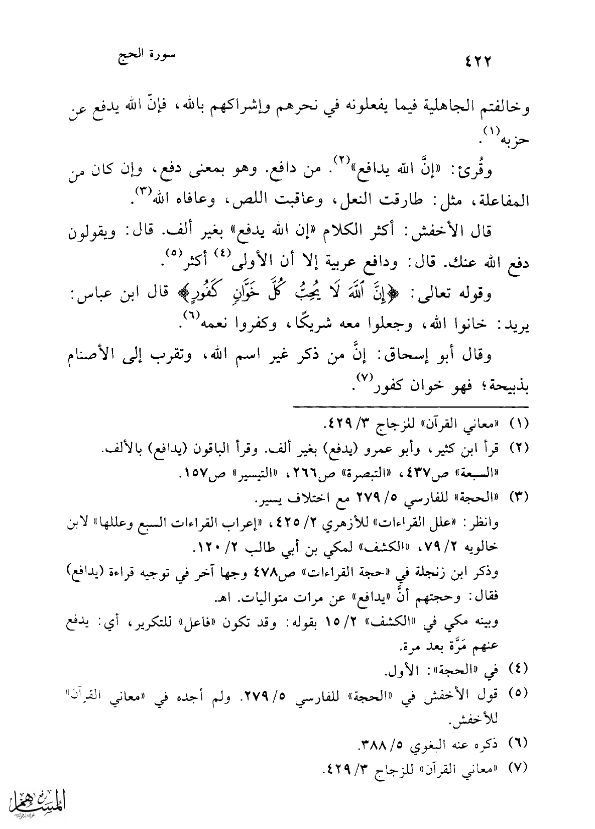 (¬2) قرأ ابن كثير، وأبو عمرو (يدفع) بغير ألف. وقرأ الباقون (يدافع) بالألف. "السبعة" ص 437، "التبصرة" ص 266، "التيسير" ص 157.