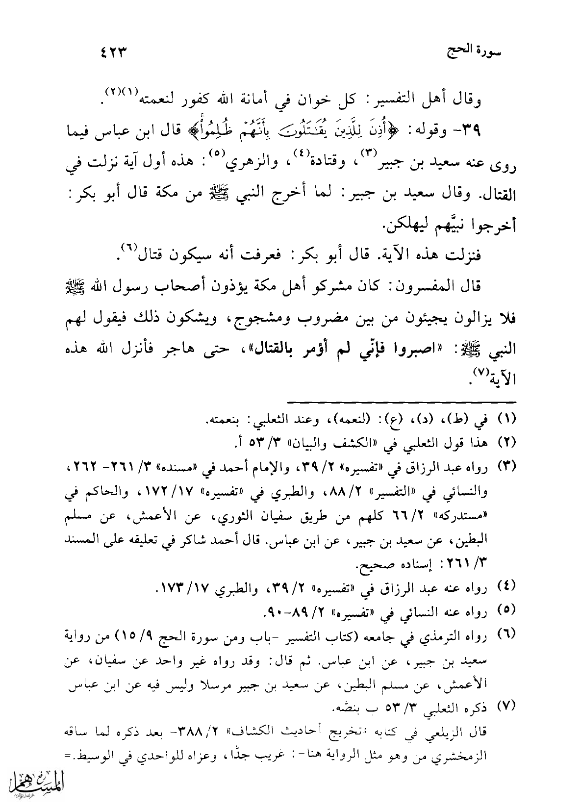 (¬6) رواه الترمذي في جامعه (كتاب التفسير -باب ومن سورة الحج 9/ 15) من رواية سعيد بن جبير، عن ابن عباس. ثم قال: وقد رواه غير واحد عن سفيان، عن الأعمش، عن مسلم البطين، عن سعيد بن جبير مرسلا وليس فيه عن ابن عباس.
