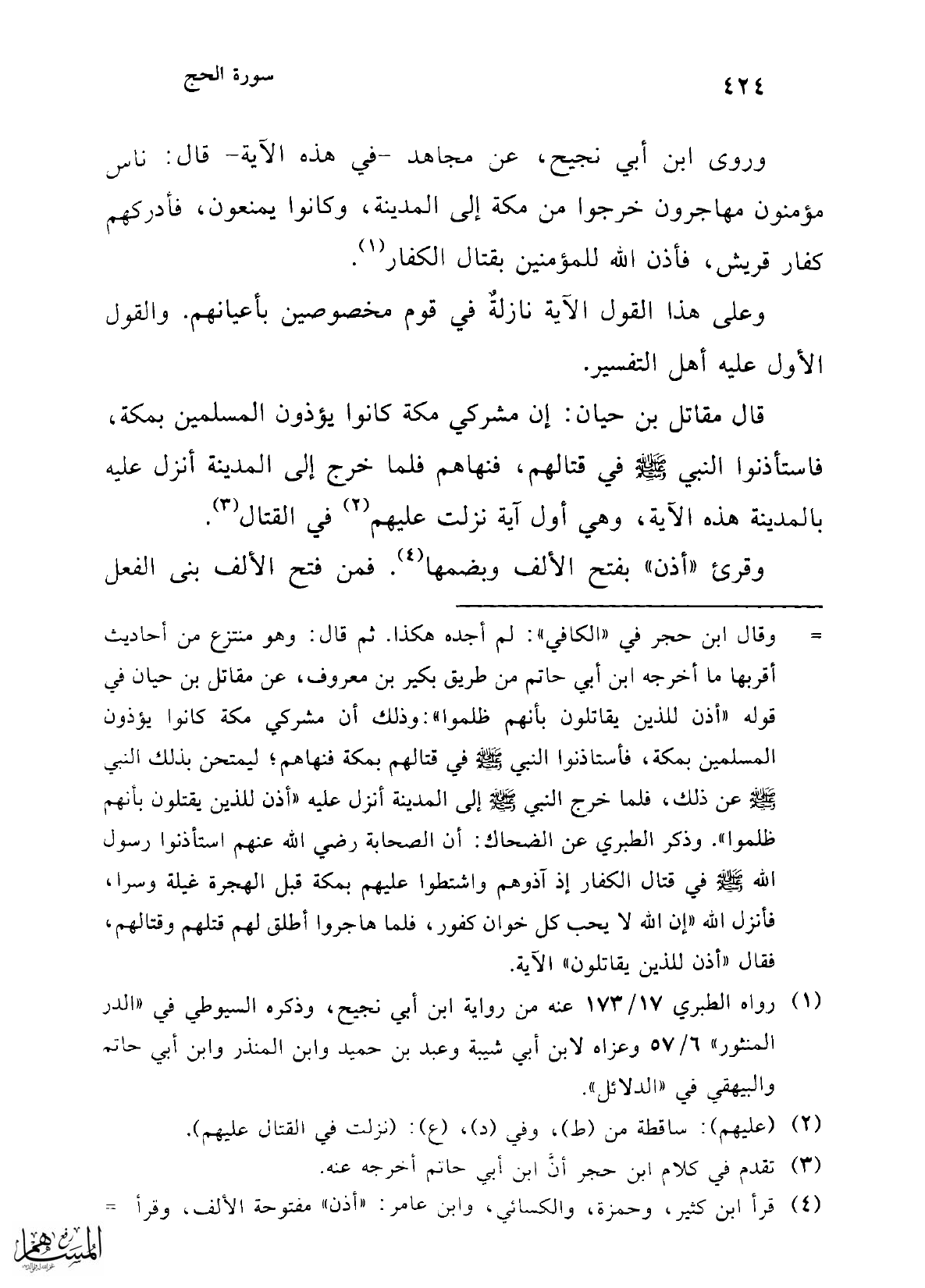 = وقال ابن حجر في "الكافي": لم أجده هكذا. ثم قال: وهو منتزع من أحاديث أقربها ما أخرجه ابن أبي حاتم من طريق بكير بن معروف، عن مقاتل بن حيان في قوله "أذن للذين يقاتلون بأنهم ظلموا": وذلك أن مشركي مكة كانوا يؤذون المسلمين بمكة، فأستاذنوا النبي -صلى الله عليه وسلم- في قتالهم بمكة فنهاهم؛ ليمتحن بذلك النبي -صلى الله عليه وسلم- عن ذلك، فلما خرج النبي -صلى الله عليه وسلم- إلى المدينة أنزل عليه "أذن للذين يقتلون بأنهم ظلموا". وذكر الطبري عن الضحاك: أن الصحابة رضي الله عنهم استأذنوا رسول الله -صلى الله عليه وسلم- في قتال الكفار إذ آذوهم واشتطوا عليهم بمكة قبل الهجرة غيلة وسرا، فأنزل الله "إن الله لا يحب كل خوان كفور، فلما هاجروا أطلق لهم قتلهم وقتالهم، فقال "أذن للذين يقاتلون" الآية.