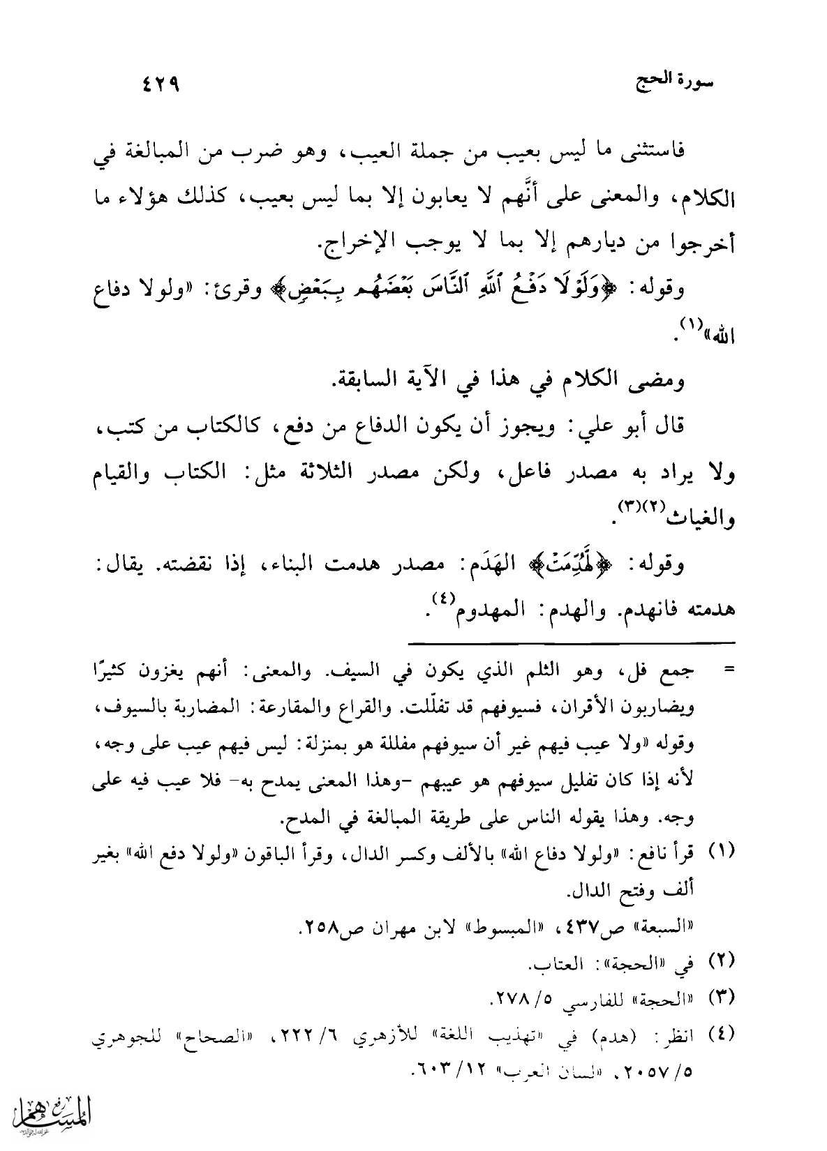 (¬1) قرأ نافع: "ولولا دفاع الله" بالألف وكسر الدال، وقرأ الباقون "ولولا دفع الله" بغير ألف وفتح الدال.