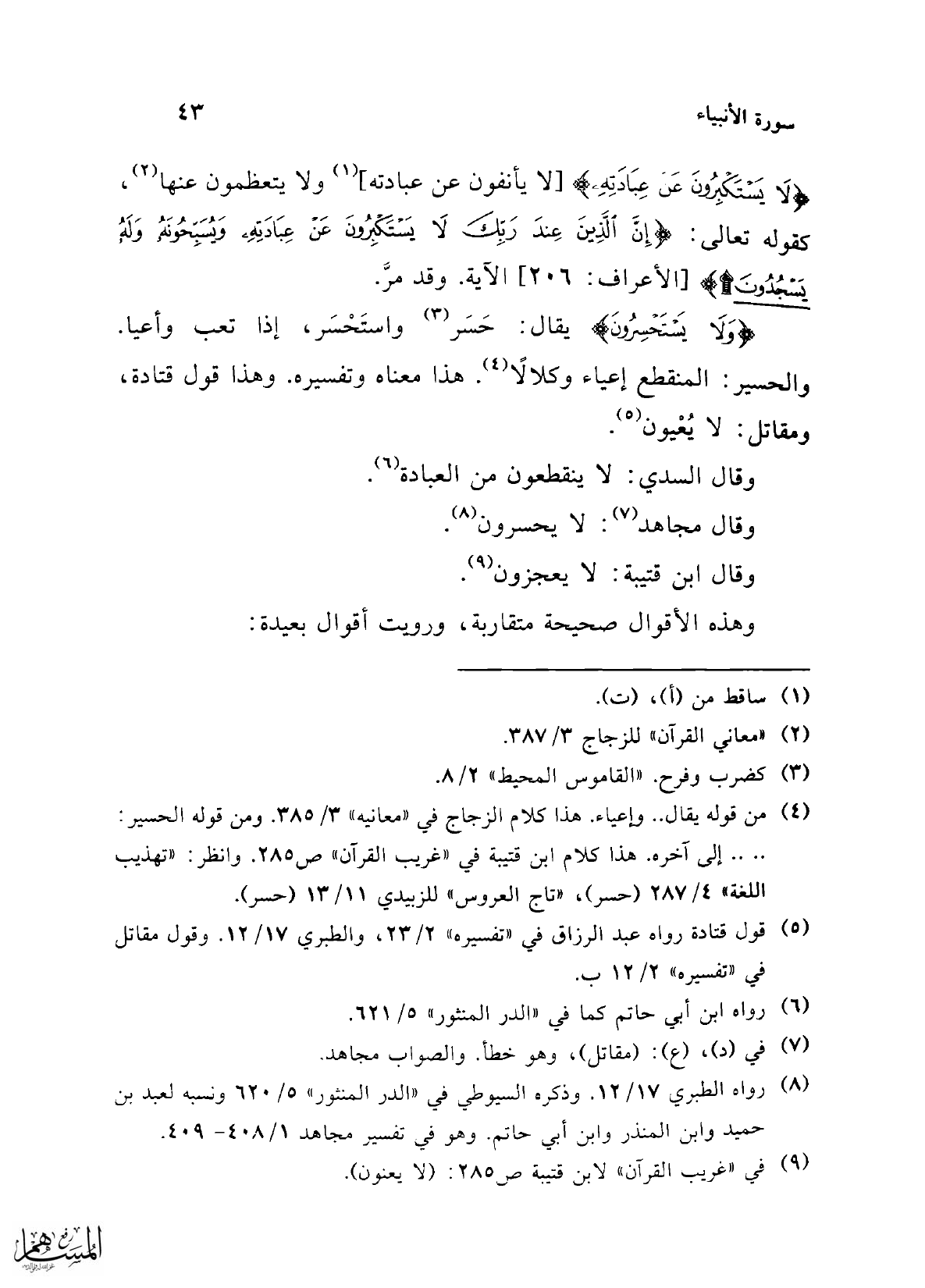 {وَلَا يَسْتَحْسِرُونَ} يقال: حَسَر (¬3) واستَحْسَر، إذا تعب وأعيا. والحسير: المنقطع إعياء وكلالاً (¬4). هذا معناه وتفسيره. وهذا قول قتادة، ومقاتل: لا يُعْيون (¬5).