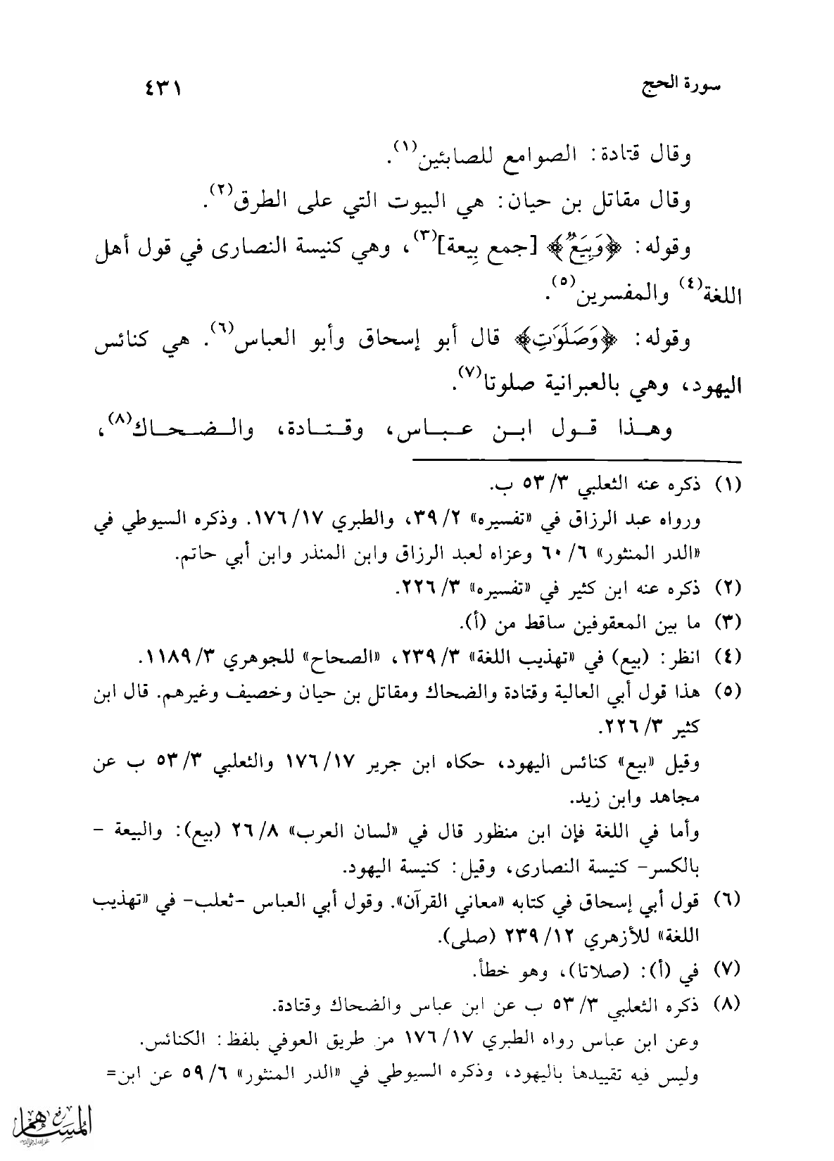 (¬6) قول أبي إسحاق في كتابه "معاني القرآن". وقول أبي العباس -ثعلب- في "تهذيب اللغة" للأزهري 12/ 239 (صلى).