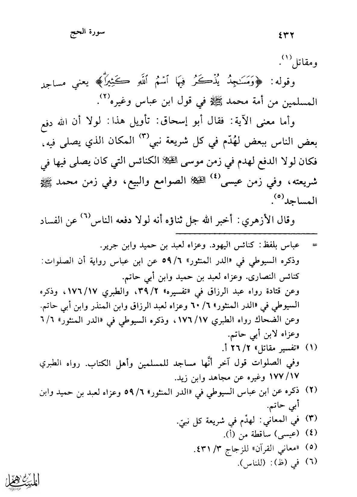 وأما معنى الآية: فقال أبو إسحاق: تأويل هذا: لولا أن الله دفع بعض الناس ببعض لهُدّم في كل شريعة نبي (¬3) المكان الذي يصلى فيه، فكان لولا الدفع لهدم في زمن موسى -عليه السلام- الكنائس التي كان يصلى فيها في شريعته، وفي زمن عيسى (¬4) -عليه السلام- الصوامع والبيع، وفي زمن محمد -صلى الله عليه وسلم- المساجد (¬5).