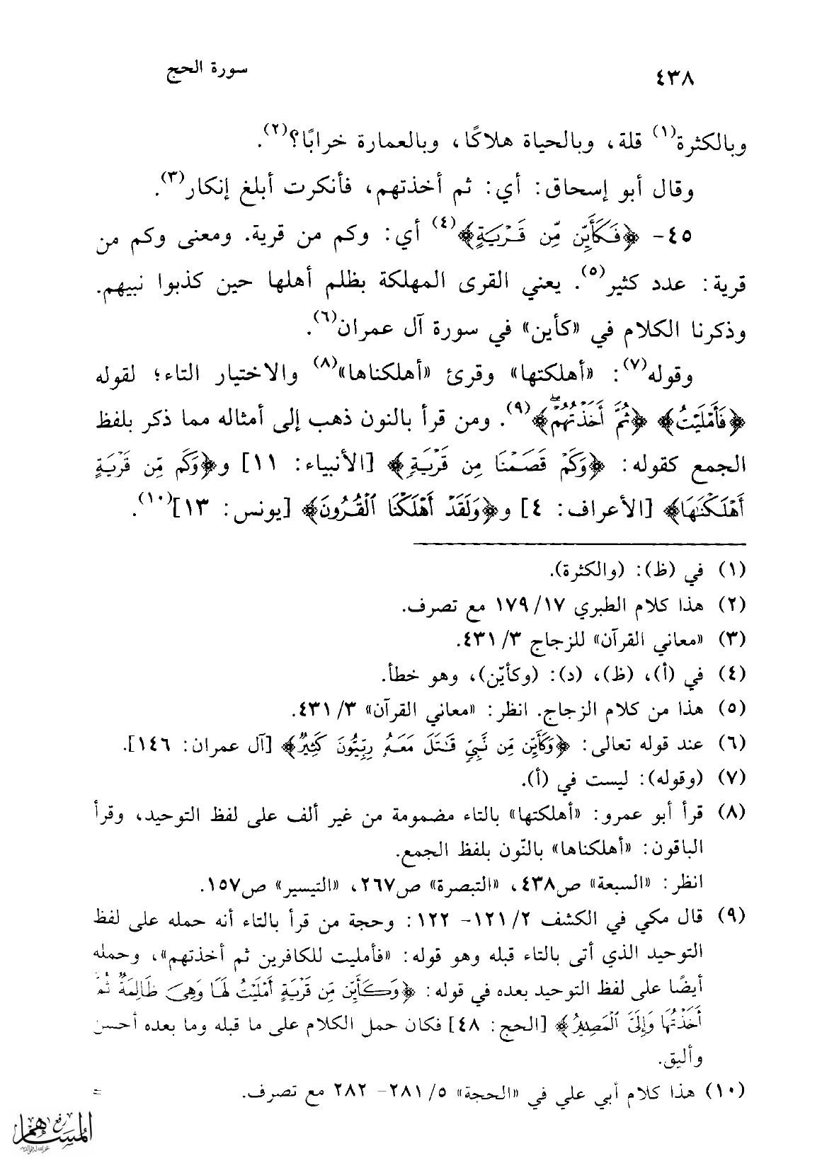 (¬8) قرأ أبو عمرو: "أهلكتها" بالتاء مضمومة من غير ألف على لفظ التوحيد، وقرأ الباقون: "أهلكناها" بالنّون بلفظ الجمع.