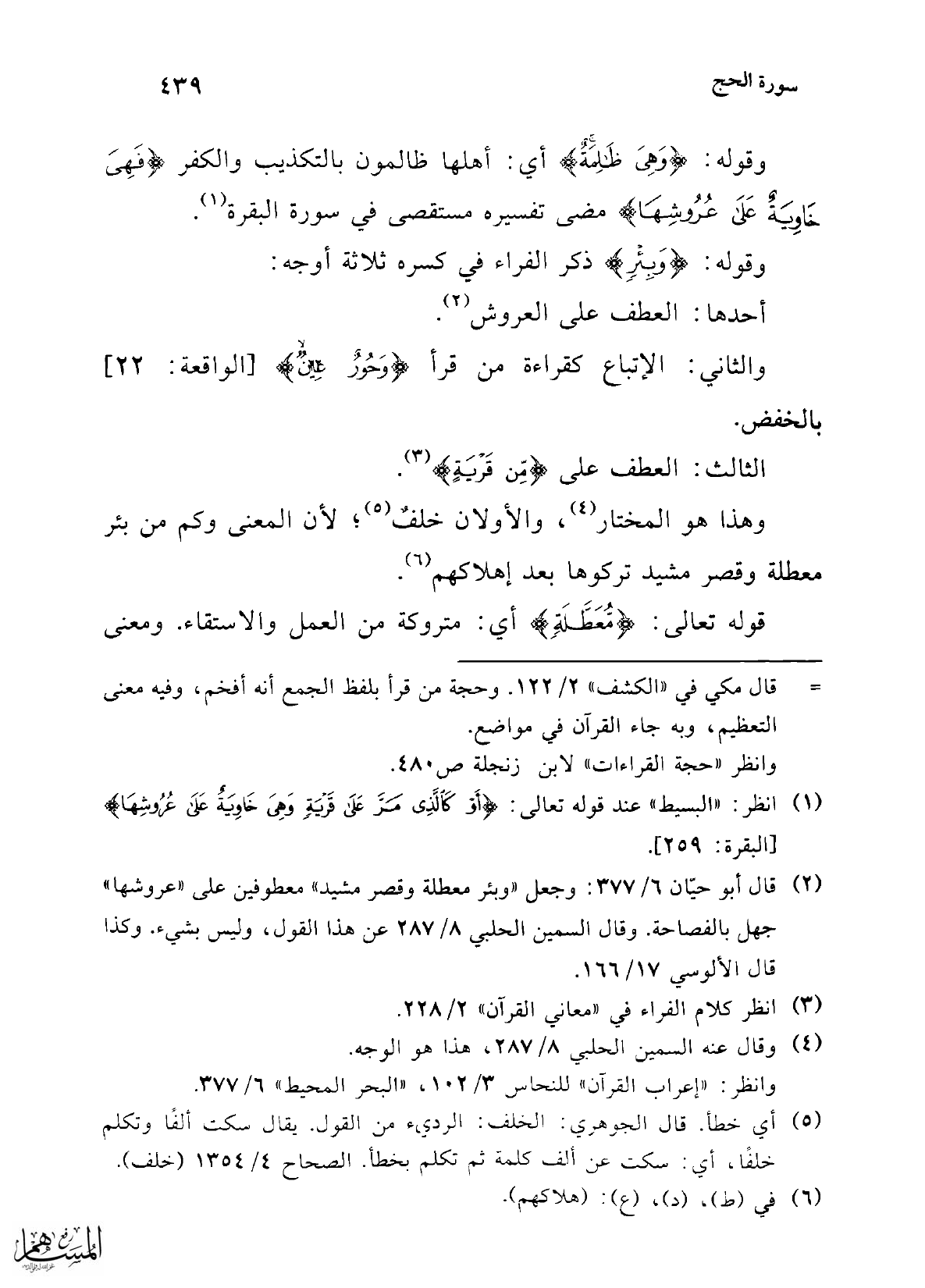 (¬2) قال أبو حبان 6/ 377: وجعل "وبئر معطلة وقصر مشيد" معطوفين على "عروشها" جهل بالفصاحة، وقال السمين الحلبي 8/ 287 عن هذا القول، وليس بشيء. وكذا قال الألوسي 17/ 166.