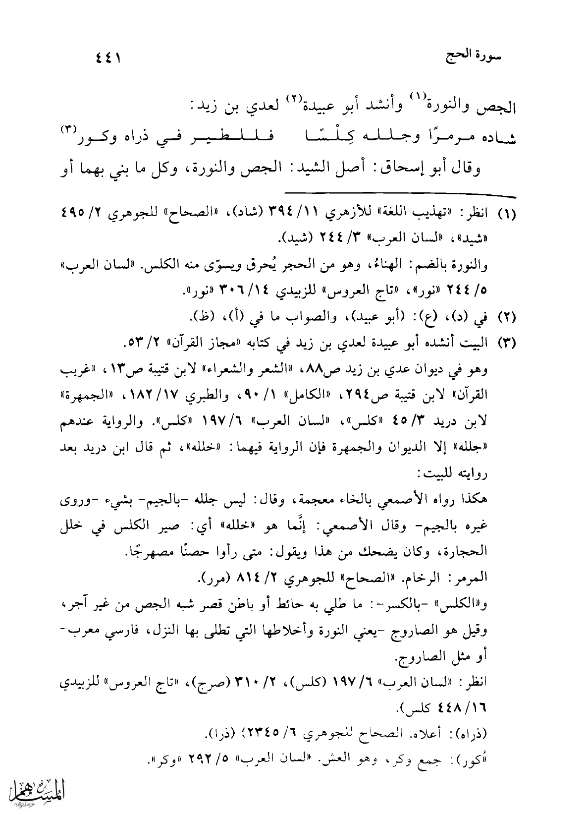 الجص والنورة (¬1) وأنشد أبو عبيدة (¬2) لعدي بن زيد: