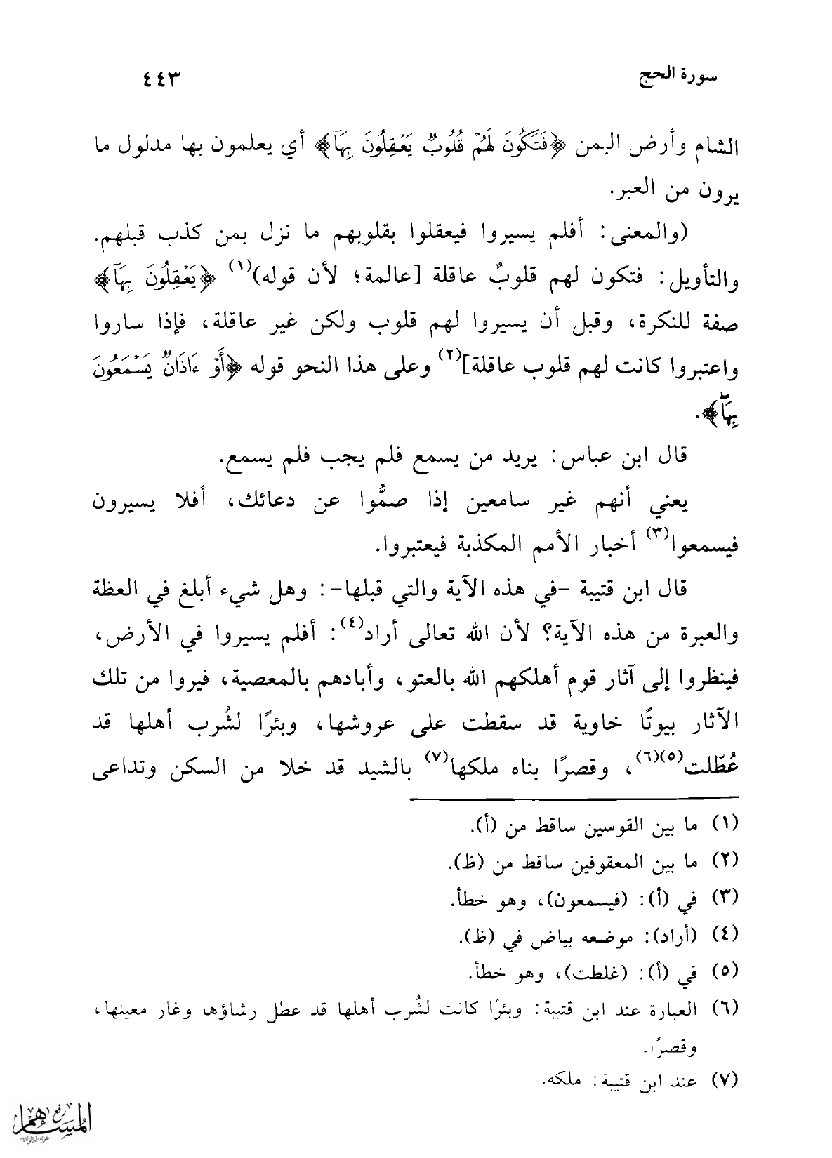 قال ابن قتيبة -في هذه الآية والتي قبلها-: وهل شيء أبلغ في العظة والعبرة من هذه الآية؟ لأن الله تعالى أراد (¬4): أفلم يسيروا في الأرض، فينظروا إلى آثار قوم أهلكهم الله بالعتو، وأبادهم بالمعصية، فيروا من تلك الآثار بيوتًا خاوية قد سقطت على عروشها، وبئرًا لشُرب أهلها قد عُطّلت (¬5) (¬6)، وقصرًا بناه ملكها (¬7) بالشيد قد خلا من السكن وتداعى