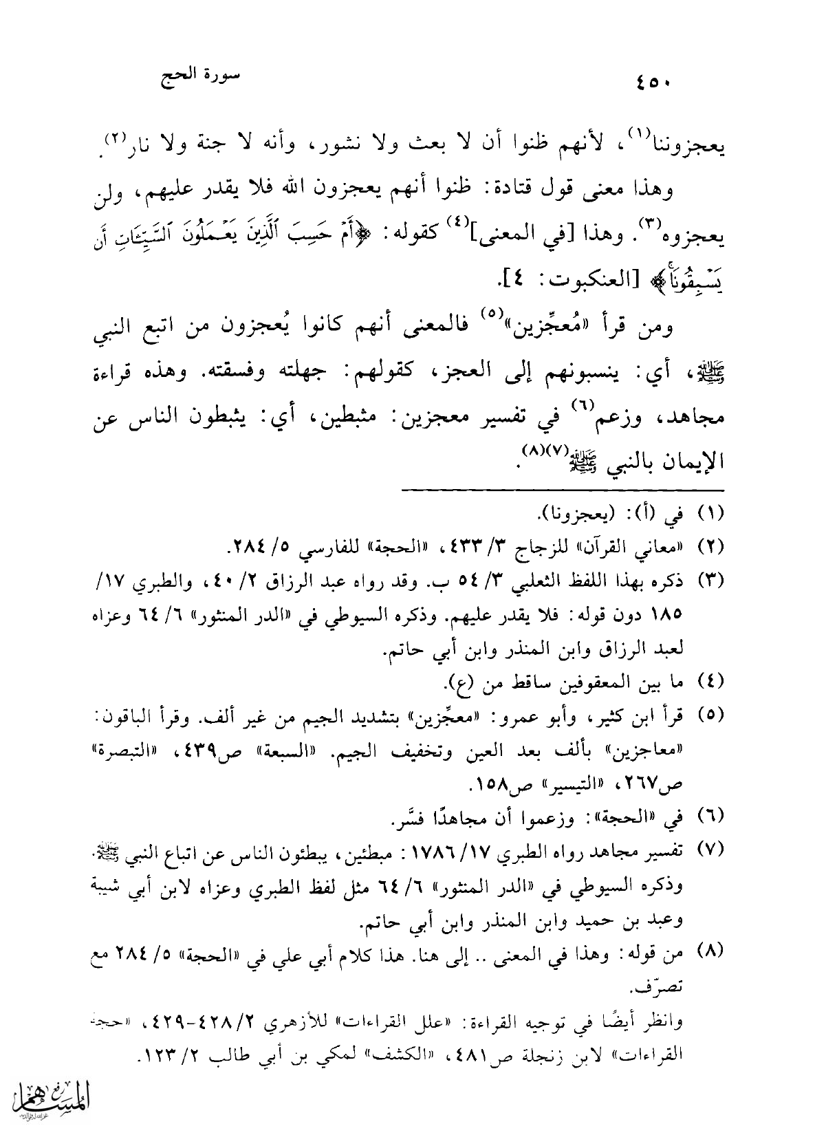(¬5) قرأ ابن كثير، وأبو عمرو: "معجِّزين" بتشديد الجيم من غير ألف. وقرأ الباقون: "معاجزين" بألف بعد العين وتخفيف الجيم. "السبعة" ص 439، "التبصرة" ص 267، "التيسير" ص 158.