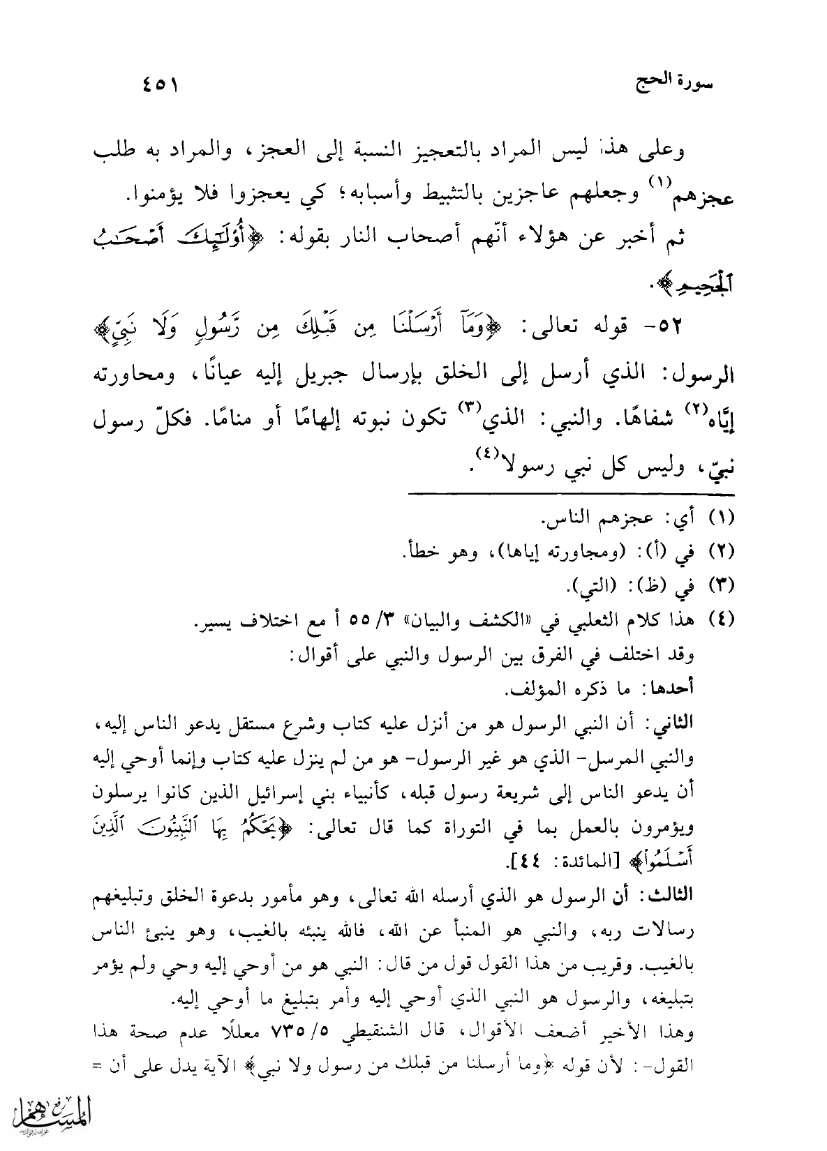 52 - قوله تعالى: {وَمَا أَرْسَلْنَا مِنْ قَبْلِكَ مِنْ رَسُولٍ وَلَا نَبِيٍّ} الرسول: الذي أرسل إلى الخلق بإرسال جبريل إليه عيانًا، ومحاورته إيَّاه (¬2) شفاهًا. والنبي: الذي (¬3) تكون نبوته إلهامًا أو منامًا. فكلّ رسول نبيّ، وليس كل نبي رسولاً (¬4).