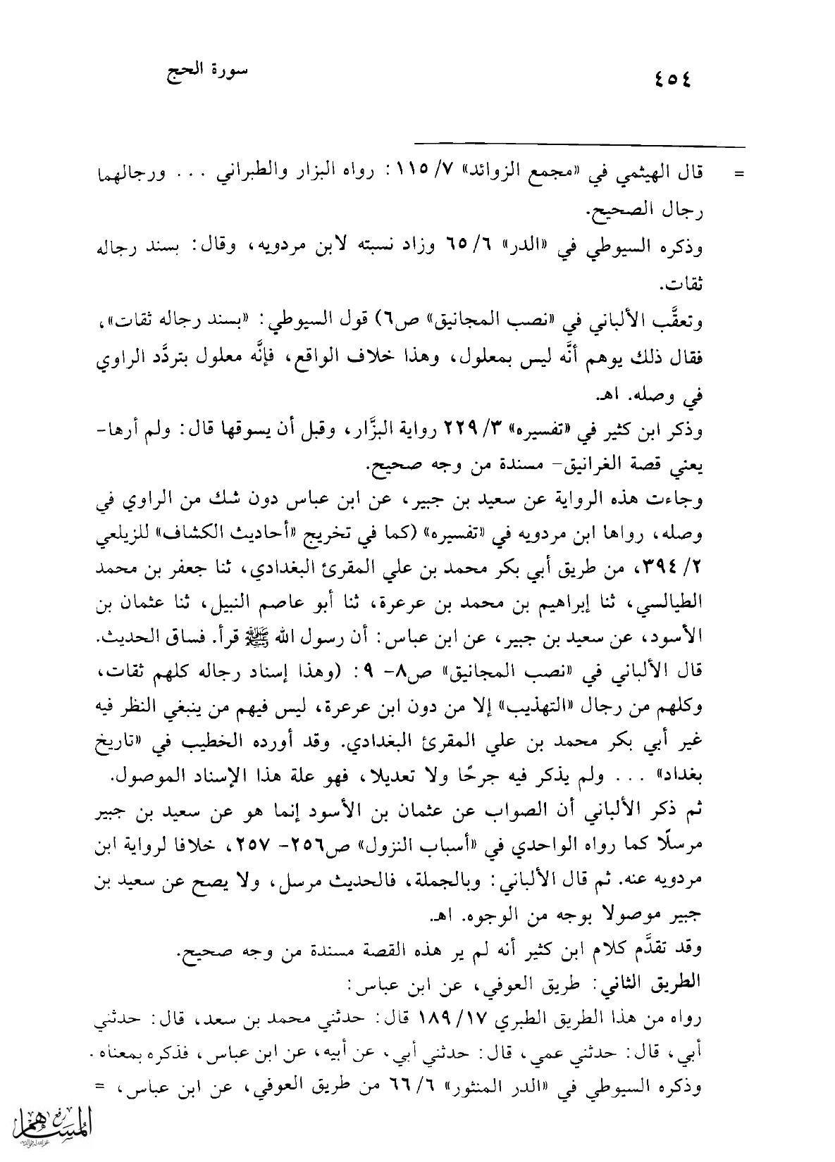 ثم ذكر الألباني أن الصواب عن عثمان بن الأسود إنما هو عن سعيد بن جبير مرسلاً كما رواه الواحدي في "أسباب النزول" ص 256 - 257، خلافا لرواية ابن مردويه عنه. ثم قال الألباني: وبالجملة، فالحديث مرسل، ولا يصح عن سعيد بن جبير موصولا بوجه من الوجوه. اهـ.