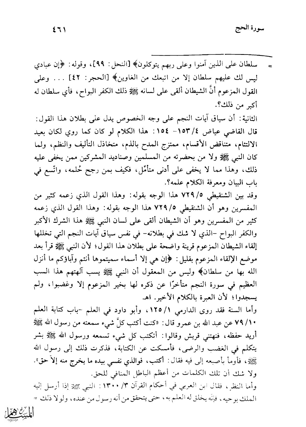 الثانية: أن سياق آيات النجم على وجه الخصوص يدل على بطلان هذا القول: قال القاضي عياض 4/ 153 - 154: هذا الكلام لو كان كما روي لكان بعيد الالتئام، متناقض الأقسام، ممتزج المدح بالذم، متخاذل التأليف والنظم، ولما كان النبي -صلى الله عليه وسلم- ولا من بحضرته من المسلمين وصناديد المشركين ممن يخفى عليه ذلك، وهذا مما لا يخفى على أدنى متأمِّل، فكيف بمن رجح حُلمه، واتّسع في باب البيان ومعرفة الكلام علمه؟.