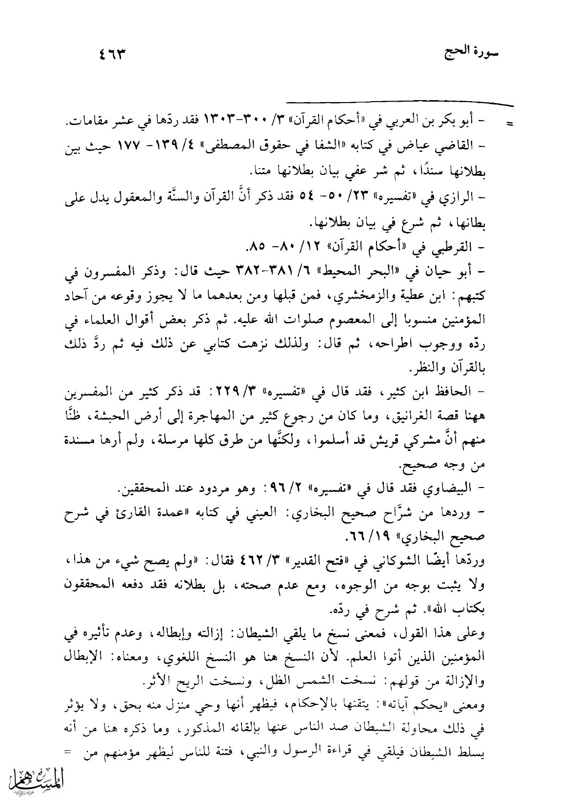 = - أبو بكر بن العربي في "أحكام القرآن" 3/ 300 - 1303 فقد ردّها في عشر مقامات.