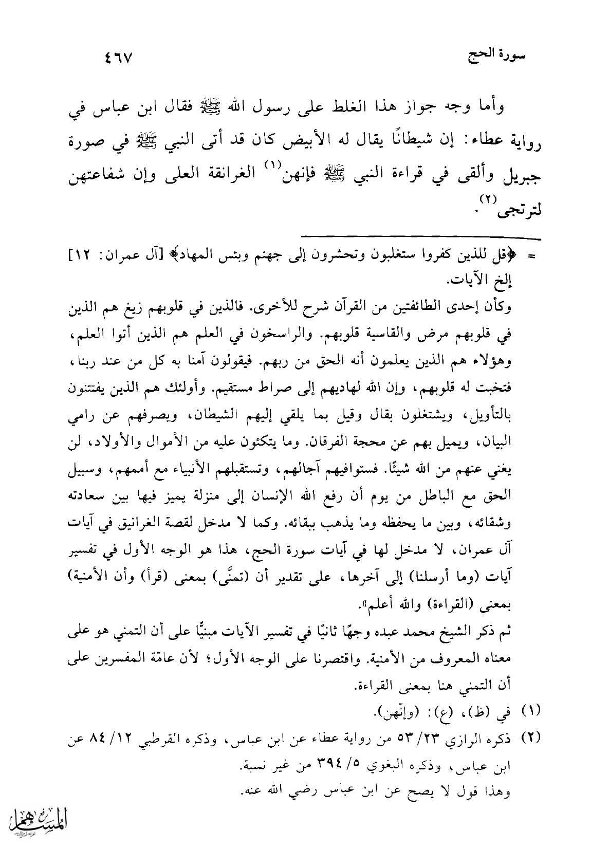 وكأن إحدى الطائفتين من القرآن شرح للأخرى. فالذين في قلوبهم زيغ هم الذين في قلوبهم مرض والقاسية قلوبهم. والراسخون في العلم هم الذين أتوا العلم، وهؤلاء هم الذين يعلمون أنه الحق من ربهم. فيقولون آمنا به كل من عند ربنا، فتخبت له قلوبهم، وإن الله لهاديهم إلى صراط مستقيم. وأولئك هم الذين يفتتنون بالتأويل، ويشتغلون بقال وقيل بما يلقي إليهم الشيطان، ويصرفهم عن رامي البيان، ويميل بهم عن محجة الفرقان. وما يتكئون عليه من الأموال والأولاد، لن يغني عنهم من الله شيئًا. فستوافيهم آجالهم، وتستقبلهم الأنباء مع أممهم، وسبيل الحق مع الباطل من يوم أن رفع الله الإنسان إلى منزلة يميز فيها بين سعادته وشقائه، وبين ما يحفظه وما يذهب ببقائه. وكما لا مدخل لقصة الغرانيق في آيات آل عمران، لا مدخل لها في آيات سورة الحج، هذا هو الوجه الأول في تفسير آيات (وما أرسلنا) إلى آخرها، على تقدير أن (تمنَّى) بمعنى (قرأ) وأن (الأمنية) بمعنى (القراءة) والله أعلم".