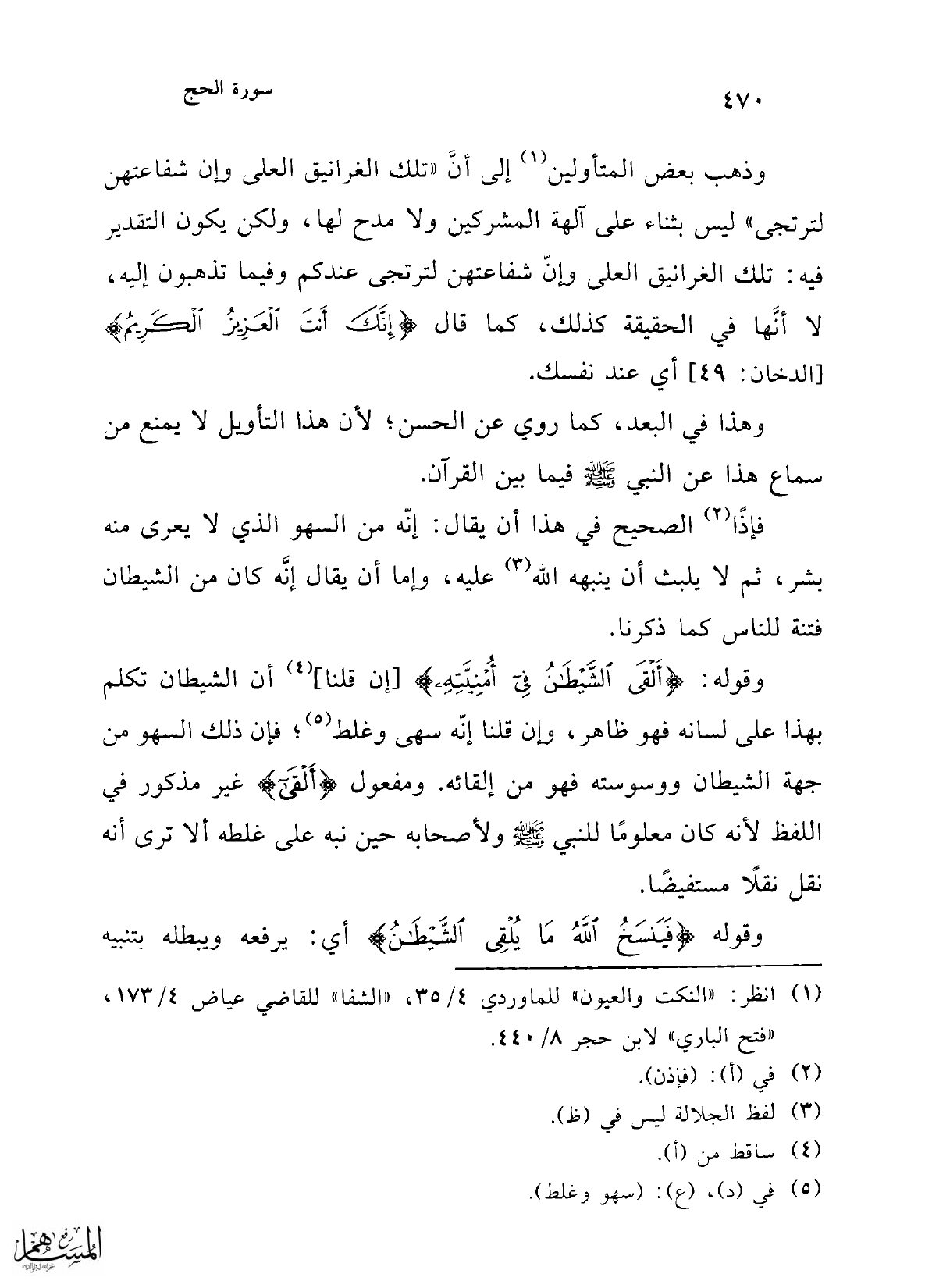 وقوله: {أَلْقَى الشَّيْطَانُ فِي أُمْنِيَّتِهِ} [إن قلنا] (¬4) أن الشيطان تكلم بهذا على لسانه فهو ظاهر، وإن قلنا إنّه سهى وغلط (¬5)؛ فإن ذلك السهو من جهة الشيطان ووسوسته فهو من إلقائه. ومفعول {أَلْقَى} غير مذكور في اللفظ لأنه كان معلومًا للنبي -صلى الله عليه وسلم- ولأصحابه حين نبه على غلطه ألا ترى أنه نقل نقلًا مستفيضًا.