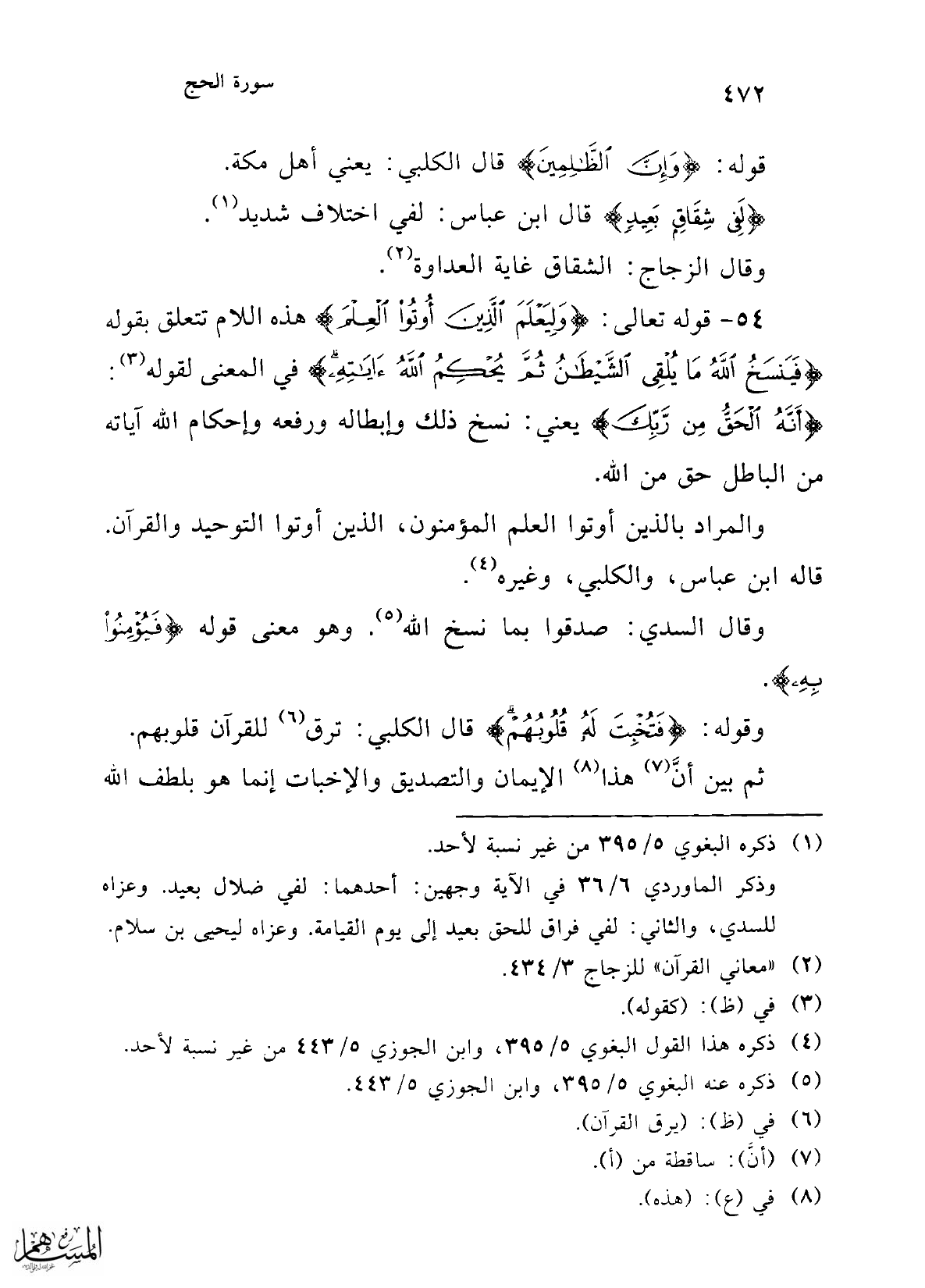 54 - قوله تعالى: {وَلِيَعْلَمَ الَّذِينَ أُوتُوا الْعِلْمَ} هذه اللام تتعلق بقول {فَيَنْسَخُ اللَّهُ مَا يُلْقِي الشَّيْطَانُ ثُمَّ يُحْكِمُ اللَّهُ آيَاتِهِ} في المعنى لقوله (¬3): {أَنَّهُ الْحَقُّ مِنْ رَبِّكَ} يعني: نسخ ذلك وإبطاله ورفعه وأحكام الله آياته من الباطل حق من الله.