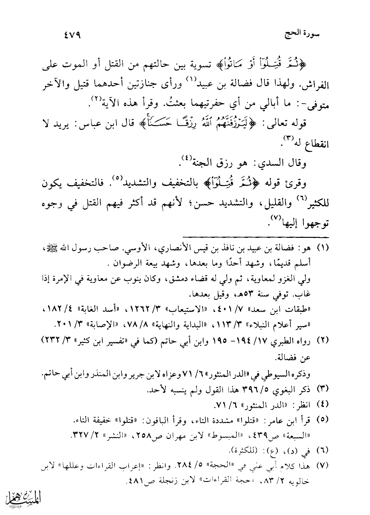 وقرئ قوله {ثُمَّ قُتِلُوا} بالتخفيف والتشديد (¬5). فالتخفيف يكون للكثير (¬6) والقليل، والتشديد حسن؛ لأنهم قد أكثر فيهم القتل في وجوه توجهوا إليها (¬7).