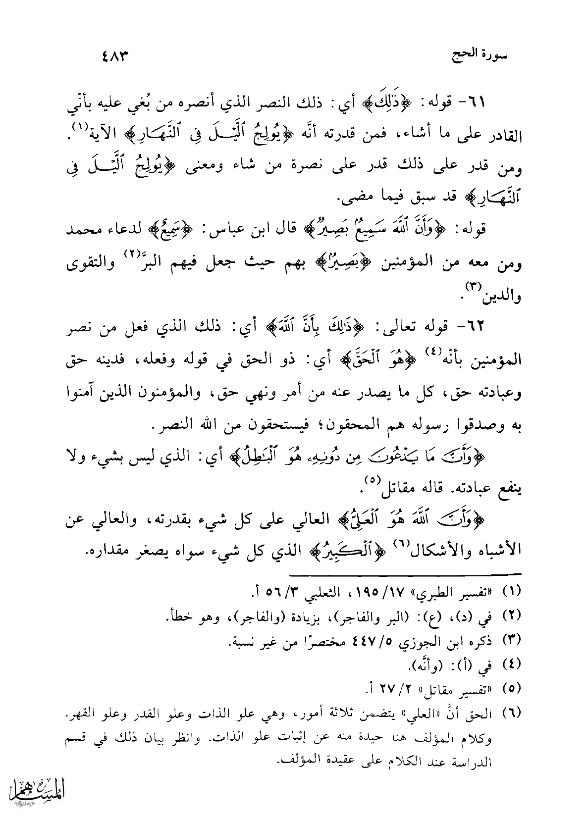 61 - قوله: {ذَلِكَ} أي: ذلك النصر الذي أنصره من بُغي عليه بأنّي القادر على ما أشاء، فمن قدرته أنَّه {يُولِجُ اللَّيْلَ فِي النَّهَارِ} الآية (¬1). ومن قدر على ذلك قدر على نصرة من شاء ومعنى {يُولِجُ اللَّيْلَ فِي النَّهَارِ} قد سبق فيما مضى.