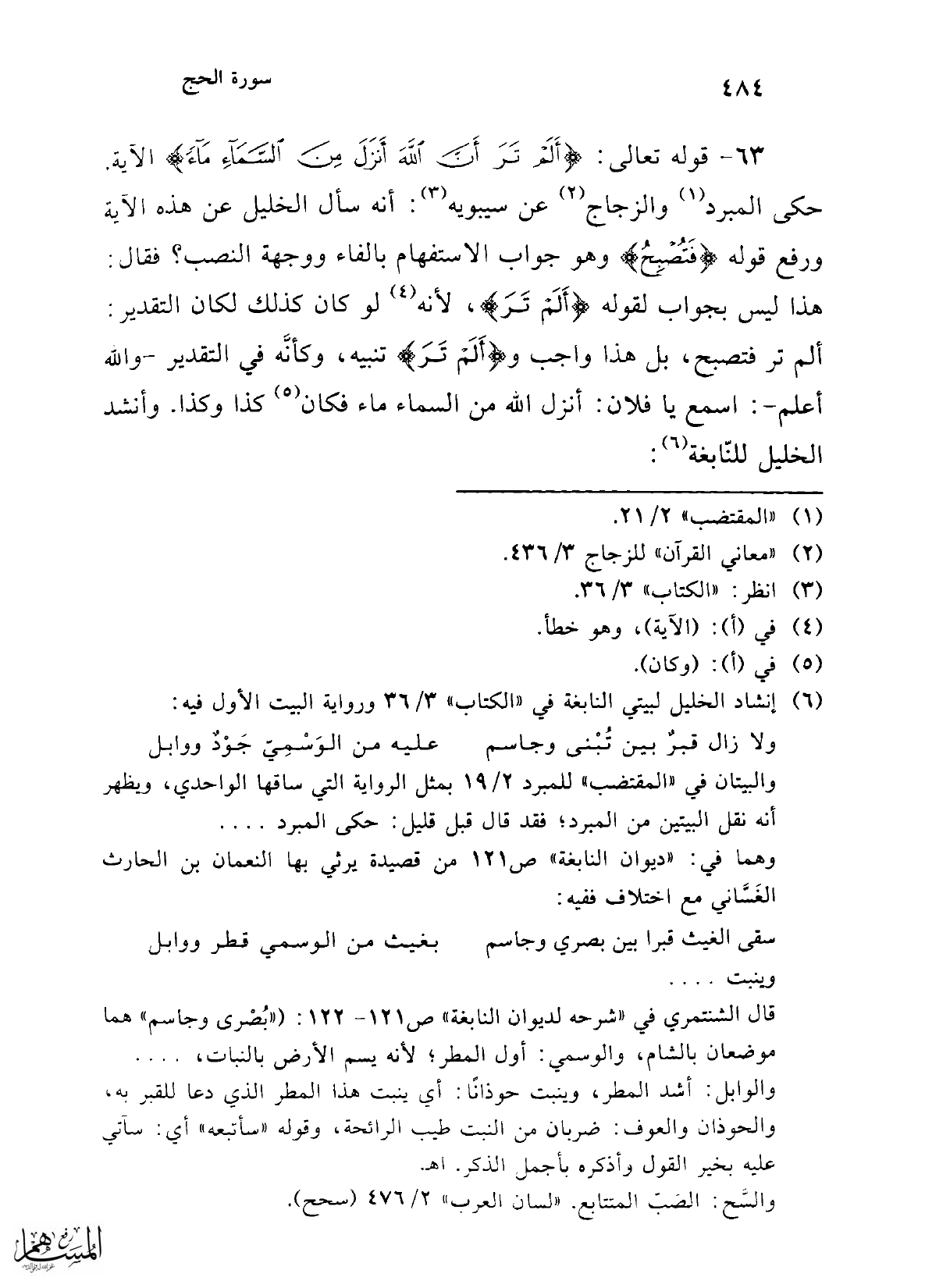 63 - قوله تعالى: {أَلَمْ تَرَ أَنَّ اللَّهَ أَنْزَلَ مِنَ السَّمَاءِ مَاءً} الآية. حكى المبرد (¬1) والزجاج (¬2) عن سيبويه (¬3): أنه سأل الخليل عن هذه الآية ورفع قوله {فَتُصْبِحُ} وهو جواب الاستفهام بالفاء ووجهة النصب؟ فقال: هذا ليس بجواب لقوله {أَلَمْ تَرَ}، لأنه (¬4) لو كان كذلك لكان التقدير: ألم تر فتصبح، بل هذا واجب و {أَلَمْ تَرَ} تنبيه، وكأنَّه في التقدير-والله أعلم-: اسمع يا فلان: أنزل الله من السماء ماء فكان (¬5) كذا وكذا. وأنشد الخليل للنّابغة (¬6):