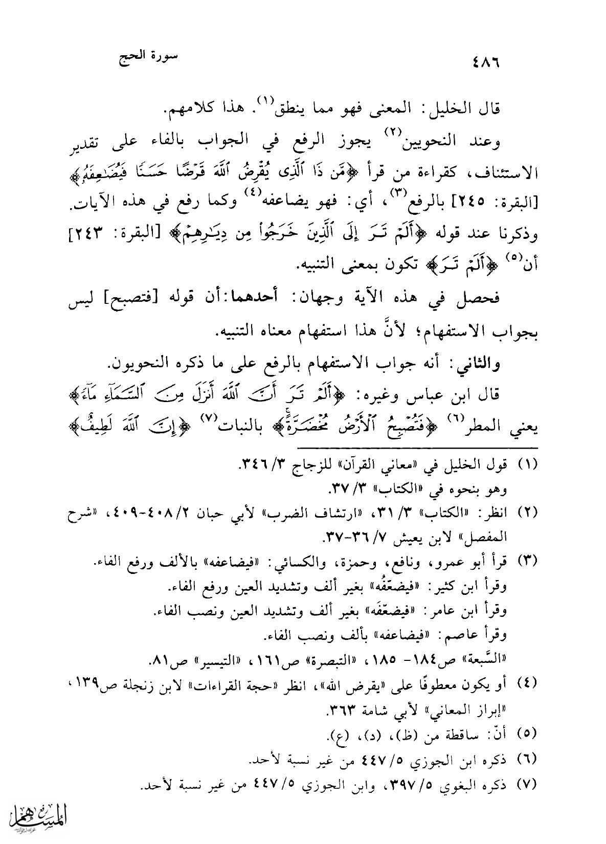 وعند النحويين (¬2) يجوز الرفع في الجواب بالفاء على تقدير الاستئناف، كقراءة من قرأ {مَنْ ذَا الَّذِي يُقْرِضُ اللَّهَ قَرْضًا حَسَنًا فَيُضَاعِفَهُ} [البقرة: 245] بالرفع (¬3)، أي: فهو يضاعفه (¬4) وكما رفع في هذه الآيات. وذكرنا عند قوله {أَلَمْ تَرَ إِلَى الَّذِينَ خَرَجُوا مِنْ دِيَارِهِمْ} [البقرة: 243] أن (¬5) {أَلَمْ تَرَ} تكون بمعنى التنبيه.